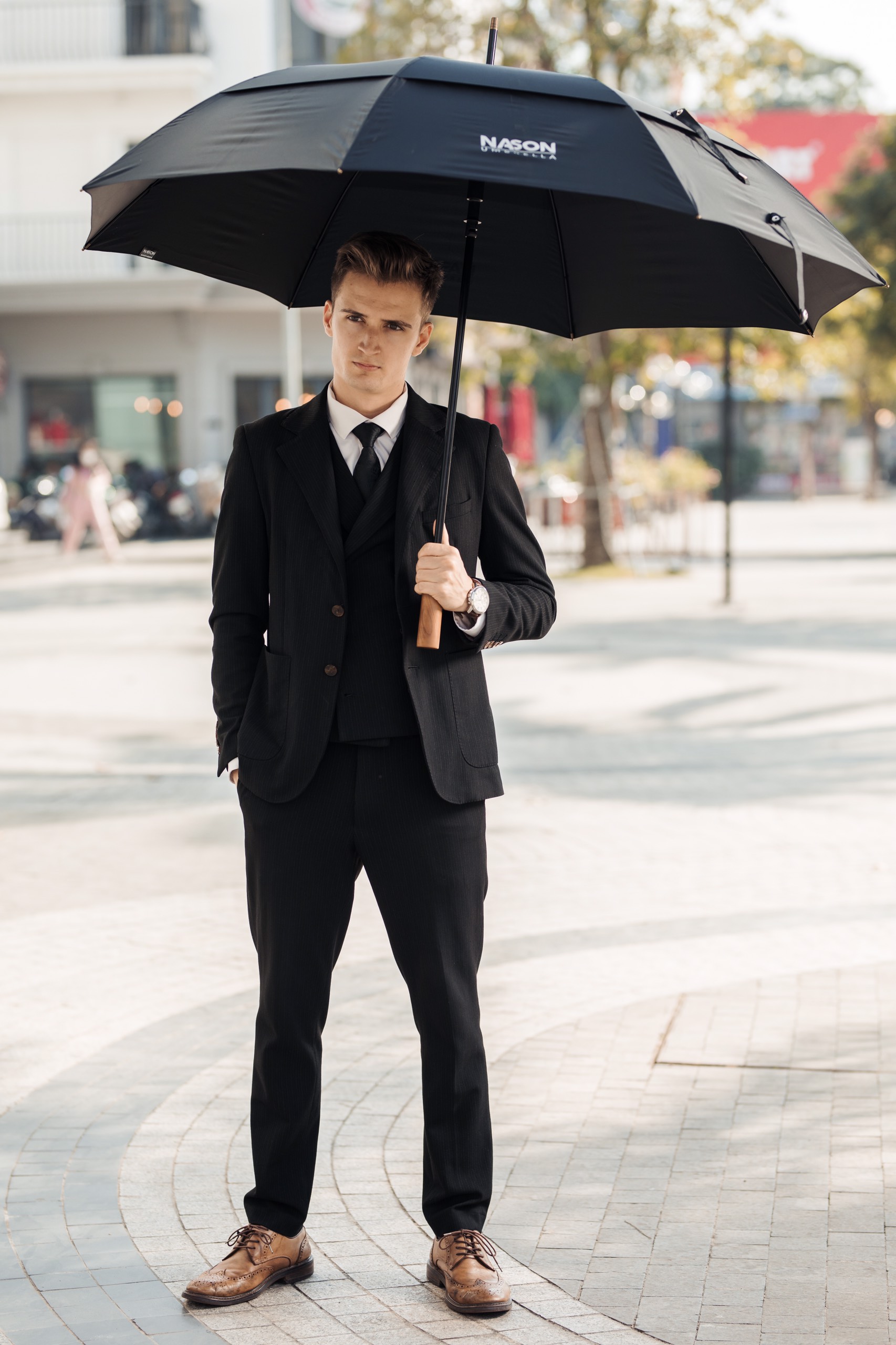 Ô tán rộng G30 tay cầm gỗ khắc tên - NASON UMBRELLA