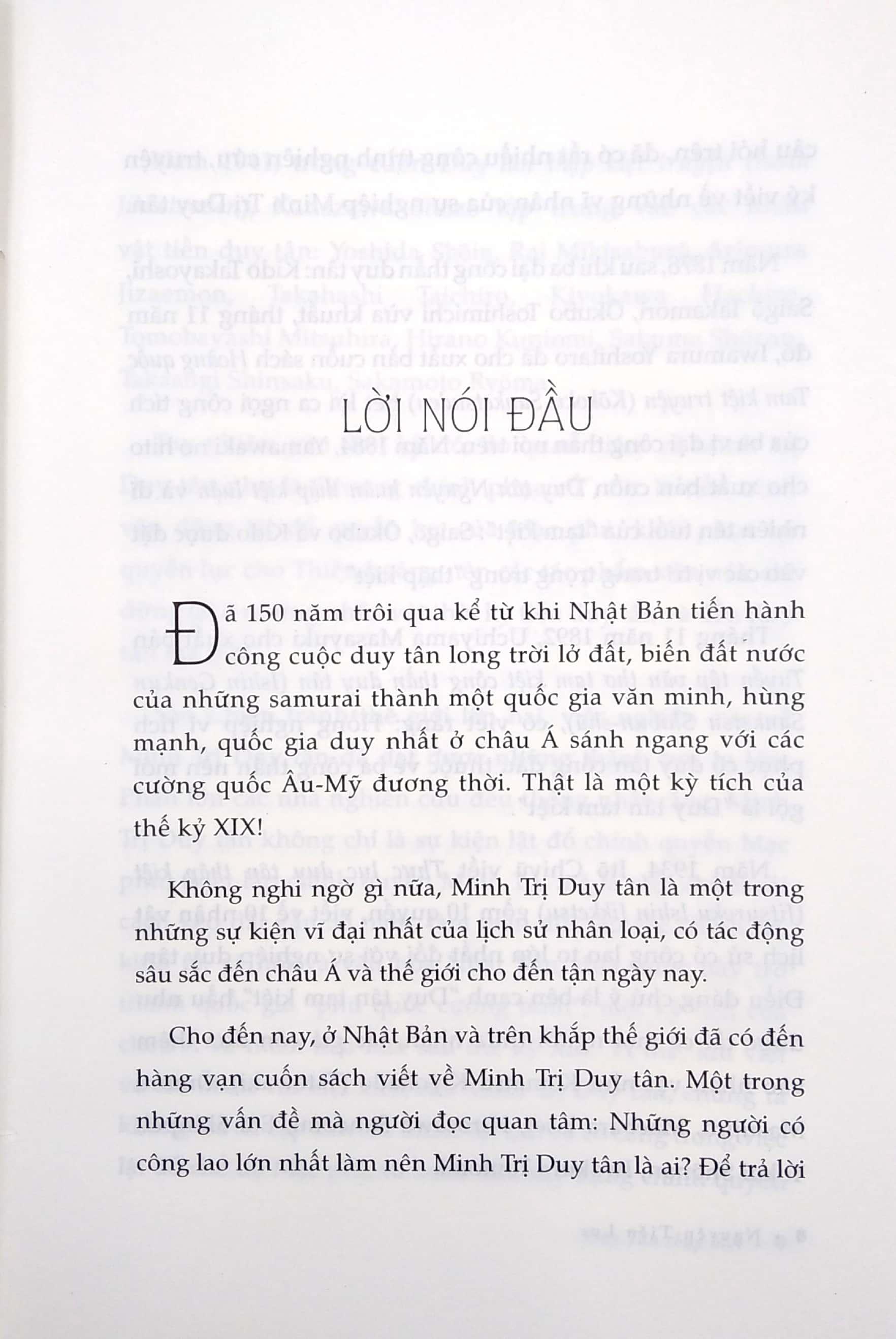 Vì thế, khi viết về các nhân vật kiệt xuất của Minh Trị Duy tân, chúng ta không chỉ đề cập đến các nhân vật lịch sử có công trong việc lật đổ chế độ Mạc phủ và bước đầu xây dựng chính quyền Minh Trị mà cả các nhân vật lịch sử có công trong việc xây dựng đất nước “phú quốc cường bình”. Hơn nữa, không chỉ đề cập đến các nhà hoạt động chính trị, quân sự mà cả các nhà tư tưởng và các nhà doanh nghiệp có công lao to lớn cho sự nghiệp duy tân.