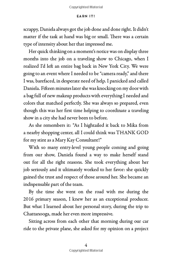 The whirlwind of job applications, interviews, follow-up, resume building, and networking is just the beginning. What happens after you've landed the job, settled in, and begun to make a difference-where do you go from here? What if you feel stuck in what you thought would be your dream profession? New York Times bestselling author Mika Brzezinski and producer Daniela Pierre-Bravo provide an essential manual for those crucial next steps. Earn It! is a practical career guidebook that not only helps you get your foot in the door; it also shows you how to negotiate a raise, advocate for more responsibility, and figure out whether you're in the career that's right for you.