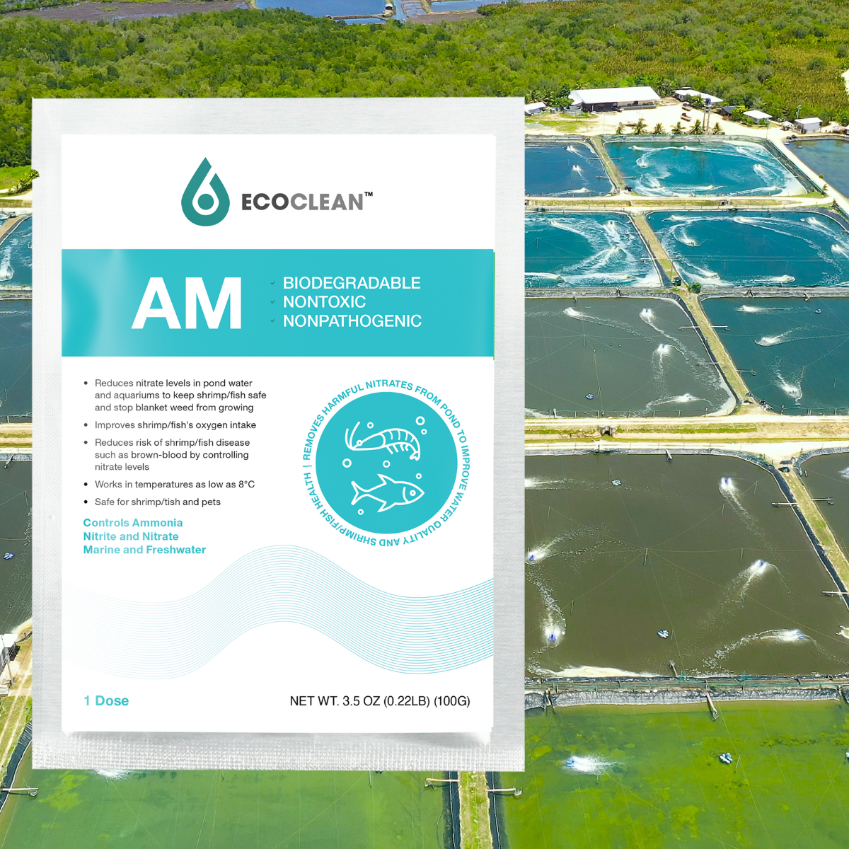 EcoClean AM là Men vi sinh được làm để chuyên xử lý khí độc, ổn định môi trường ao. Với các thành phần đặc biệt gồm có Nitrosomonas SP & Nitrobacter SP giúp chuyển hóa khí độc với cơ chế: NH3 (độc) sẽ được nhóm vi khuẩn Nitrosomonas sp chuyển hóa thành NO2, gọi là quá trình Nitrite hóa. NO2 - tiếp tục được nhóm vi khuẩn Nitrobacter sp chuyển hóa thành NO3, gọi là quá trình Nitrate hóa và đây là giai đoạn cuối của quá trình chuyển hóa.
