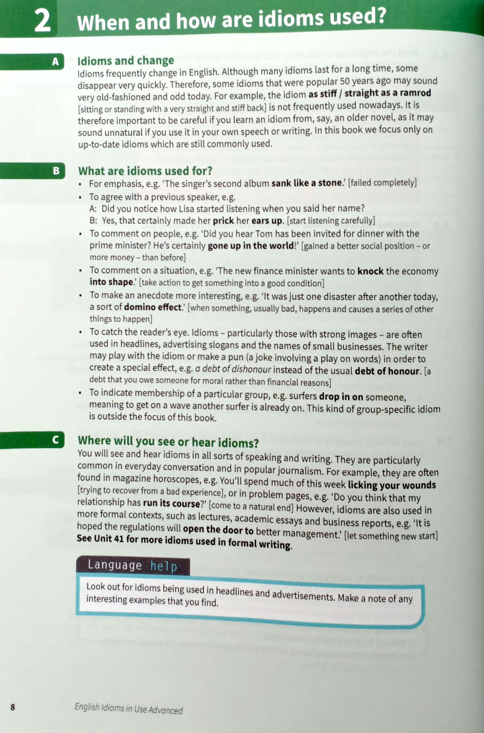 Improve your understanding of idioms in English. Explanations and practice of English idioms, written for advanced-level (C1 to C2) learners of English. Perfect for both self-study and classroom activities. Learn idioms in context, with lots of different topics, including 'Learning', 'Formal writing' and 'Telling stories'. Be confident about what you are learning, thanks to Cambridge research into how English is really spoken and written, and get better at studying by yourself, with study tips, follow-up tasks and an easy to use answer key.