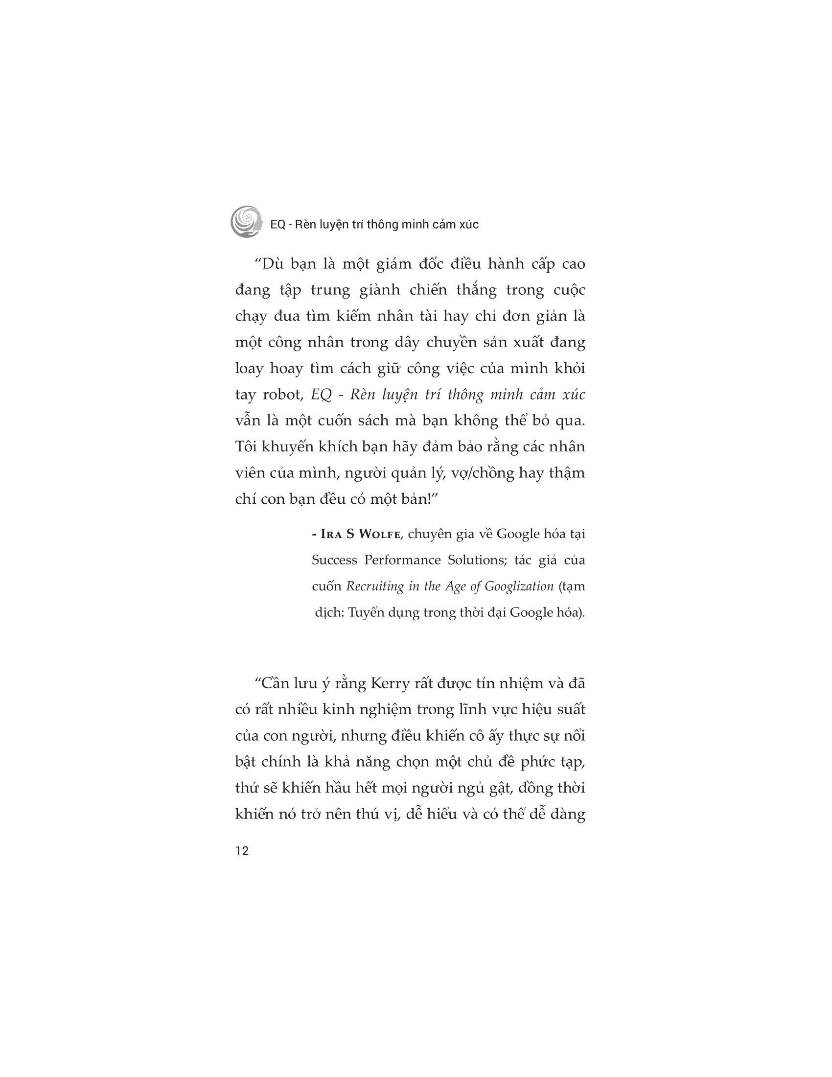 Trong cuốn sách EQ – Rèn luyện trí thông minh cảm xúc, bạn đọc sẽ tìm thấy những chỉ dẫn thực tiễn, giải trí mà vẫn hết sức sâu sắc về nguyên lý của chủ đề EQ. Bên cạnh đó là các phương pháp tận dụng trí tuệ cảm xúc để thấu hiểu bản thân, quản lý cảm xúc, thúc đẩy các mối quan hệ, từ đó đạt được nhiều thành công trong công việc và cuộc sống. Đây thực sự là một cuốn sách hữu ích với mọi người ở mọi vị trí trong công việc.