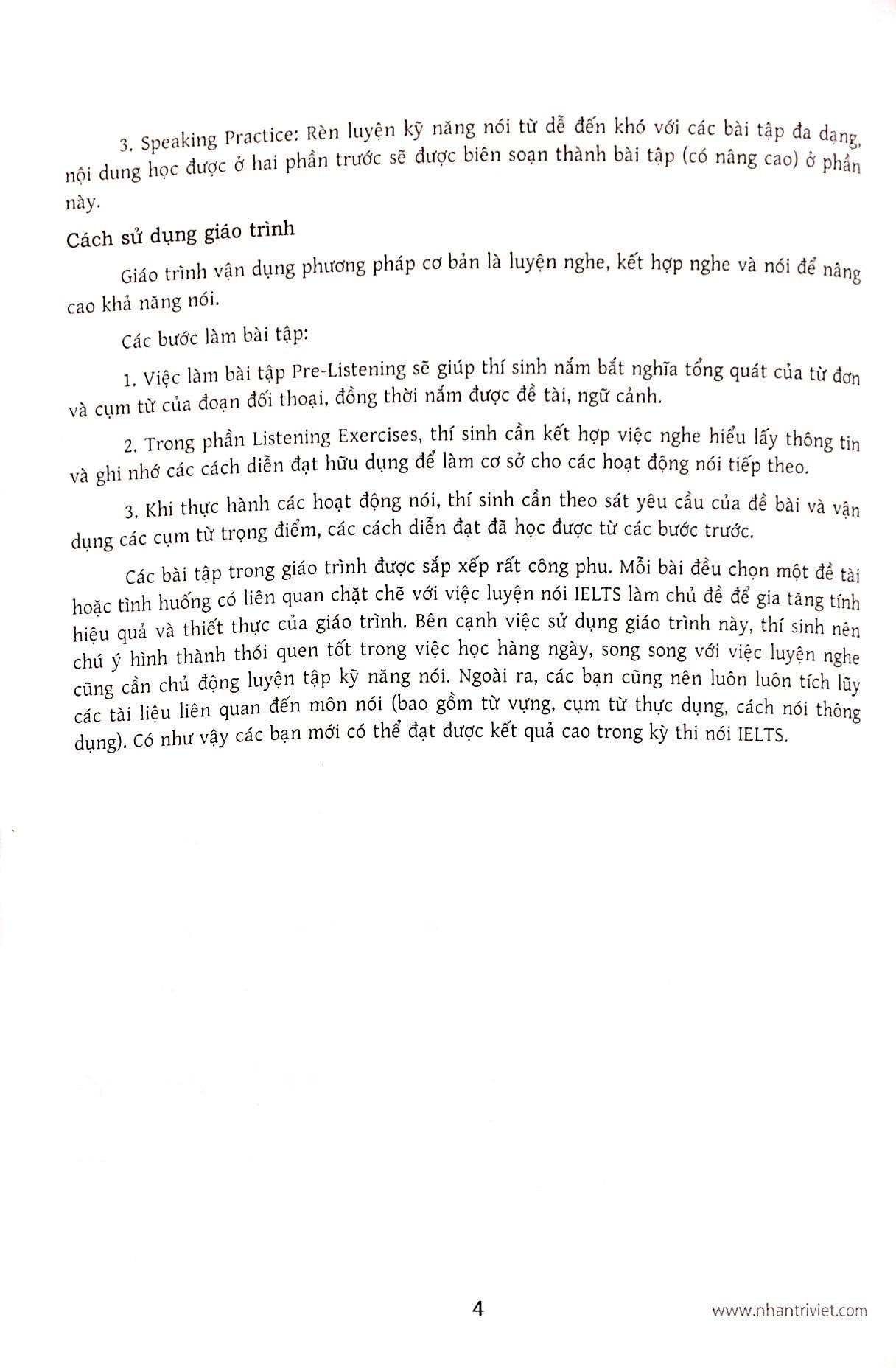 Bài thi IELTS ngày càng chú trọng việc kiểm tra năng lực tiếng Anh của thí sinh trong mọi tình huống. Đề thi nói IELTS gồm ba phần với nội dung đi từ dễ đến khó, yêu cầu thí sinh tái hiện từ những tình huống xã giao thông thường đến thảo luận khoa học, kiểm tra khả năng diễn đạt bằng ngôn ngữ nói của thí sinh trong những tình huống đó. Rất nhiều thí sinh hy vọng có thể nâng cao khả năng nói trong thời gian ngắn. Tuy nhiên, việc này – cũng như việc học tiếng Anh – đòi hỏi phải có thời gian. Do vậy, giáo trình bắt đầu từ việc luyện kỹ năng nghe nói ở trình độ cơ bản, mục đích là giúp các thí sinh từng bước tiến bộ và đạt được kết quả cao nhất trong kỳ thi nói IELTS.