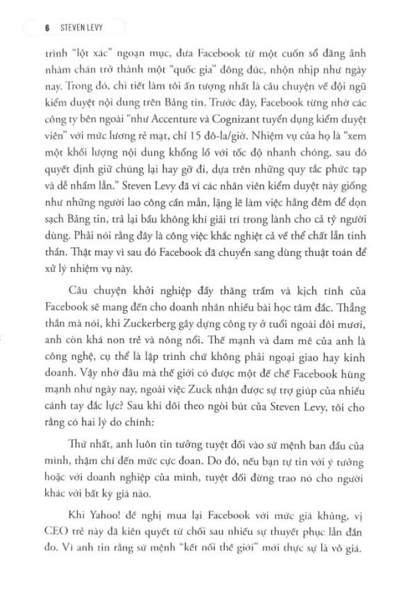 Mua tại TiktokCuốn sách nói về sự hình thành và phát triển của Facebook cùng những khó khăn, thách thức mà công ty này từng phải trải qua. Trong năm thứ hai đại học, Mark Zuckerberg đã tạo ra một trang web đơn giản hoạt động như một mạng xã hội trong khuôn viên trường. Trang này được đón nhận vô cùng mạnh mẽ và rất nhanh sau đó sinh viên trên toàn quốc đã đăng ký sử dụng Facebook. Từ một trang web đơn giản ban đầu, Mark Zuckerberg cùng đội ngũ đã nghiên cứu và phát triển thêm nhiều tính năng và ứng dụng cho Facebook, có những tính năng được đón nhận nhưng cũng có những tính năng thất bại và nhanh chóng biến mất sau đó. Và khi Facebook phát triển cũng là lúc các đối thủ cạnh tranh bắt đầu xuất hiện như Instagram, Snapchat… Cuốn sách cũng đưa ra thông tin về những cuộc đàm phán mua lại các công ty này của Zuckerberg. Càng phát triển mạnh mẽ, Facebook càng phải đối mặt với nhiều thách thức, khó khăn khi gặp phải những cáo buộc liên quan đến việc Facebook là nhân tố góp phần tác động vào kết quả của cuộc tranh cử tổng thống Mỹ năm 2016 giữa Donald Trump và Hillary Clinton khi công ty này không xử lý được việc những tin giả lan truyền trên Facebook và những hacker sử dụng nó để đánh cắp thông tin, cùng vụ bê bối dữ liệu Cambridge Analytica. Tác giả cũng đưa ra những thông tin về cách xử lý của Facebook cũng như Mark Zuckerberg đối với tin giả mạo, việc xử lý dữ liệu thông tin của người dùng cũng như kiểm duyệt nội dung.