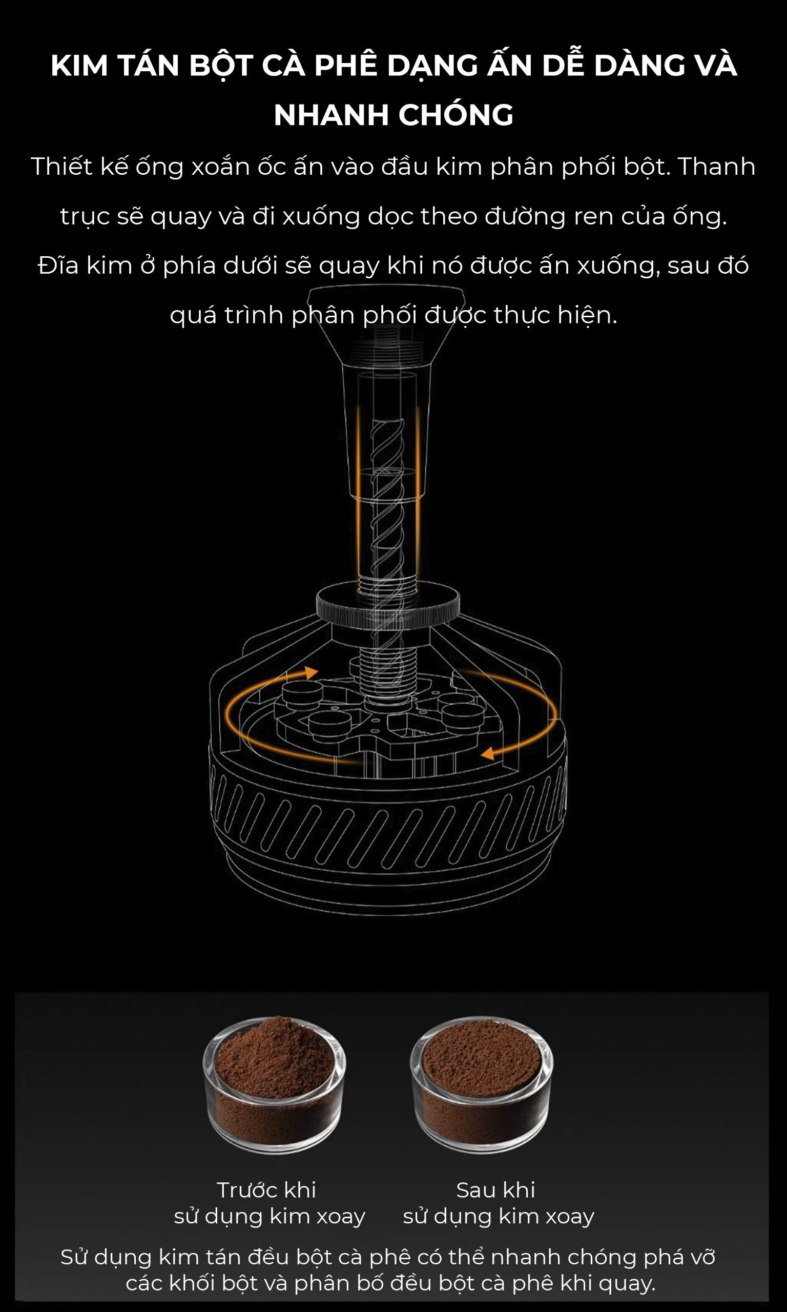 ️ Công nghệ xoắn ốc tự động xoay – Tán bột nhanh. Khi nhấn xuống, trục tự động xoay theo đường ren, giúp 14 kim phân phối bột đồng đều, tránh tình trạng bột vón cục.