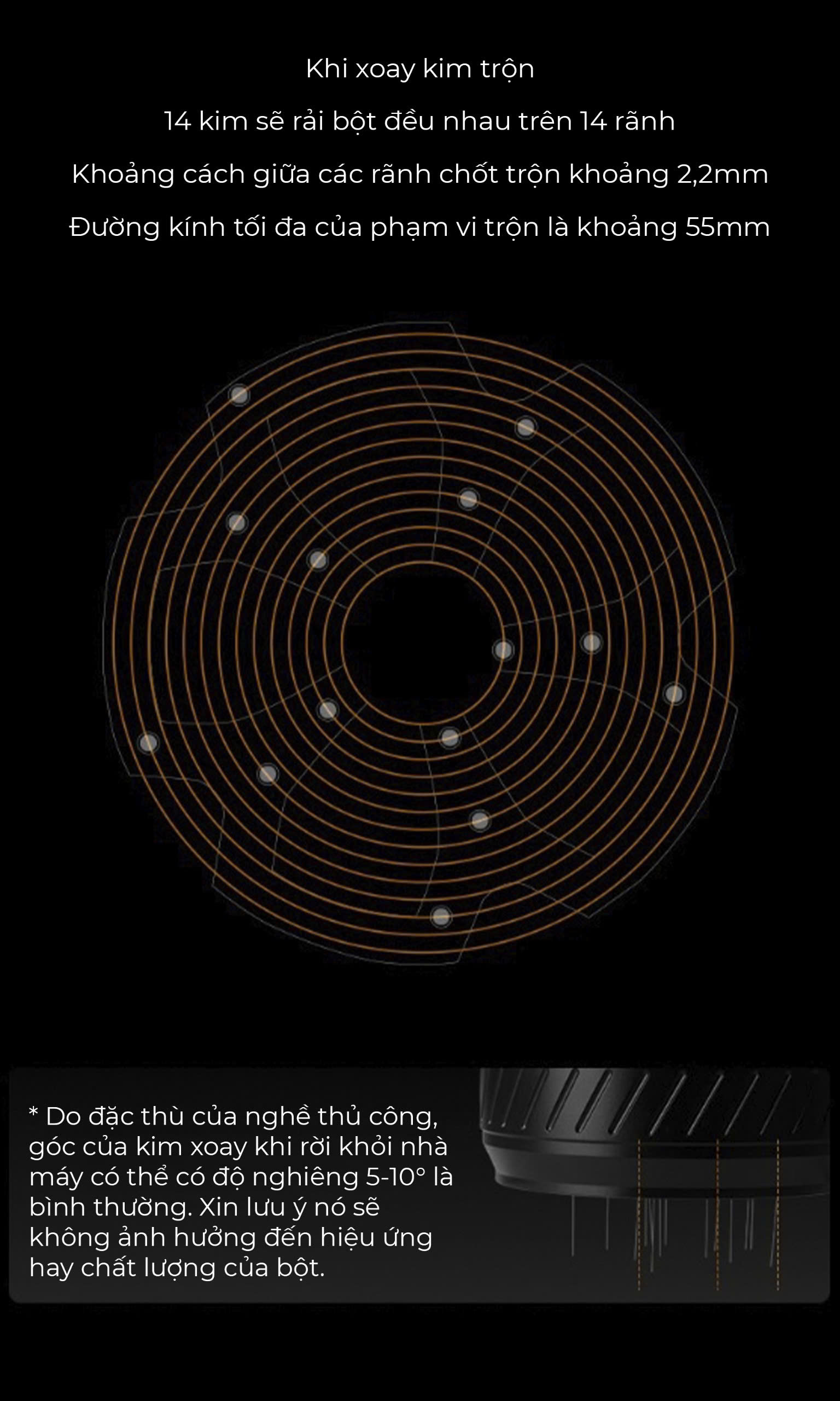 ️ Khoảng cách giữa các rãnh trộn: 2,2mm, phạm vi trộn tối đa: 55mm.