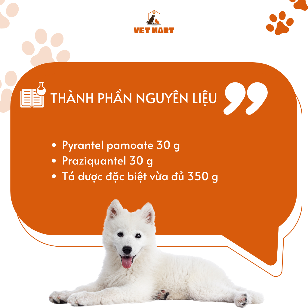 - Tẩy sạch các loại sán dây, sán lá và giun tròn ký sinh ở chó, mèo. - An toàn cho chó con, mèo con từ 4 tuần tuổi trở lên. - Sản phẩm chính