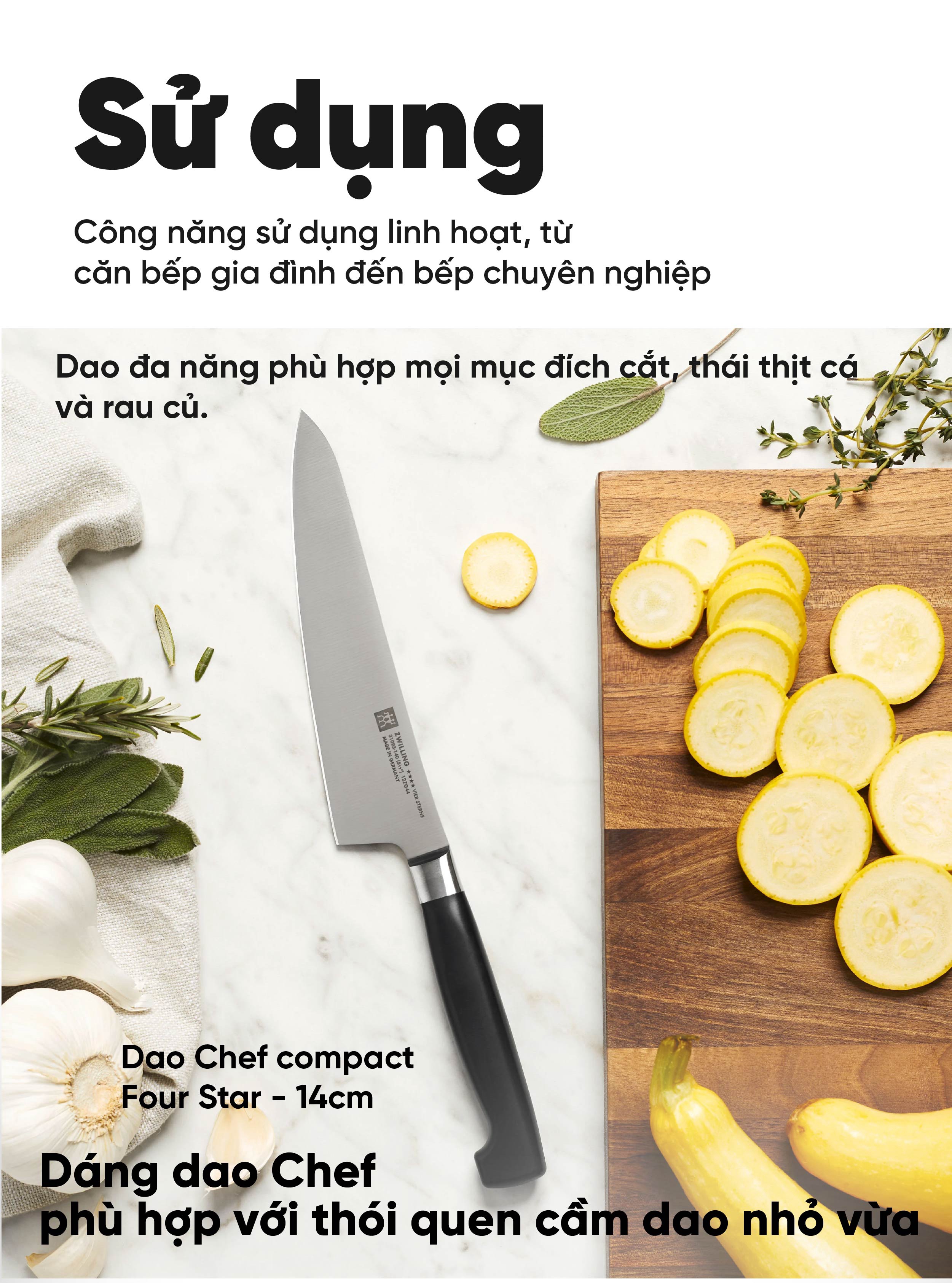 Dao Chef compact Four Star thuộc dòng dao FOUR STAR thương hiệu ZWILLING là sự kết hợp hoàn hảo giữa an toàn, tính công thái học và sự thoải mái, khiến nó trở thành dòng dao của ZWILLING bán chạy nhất trên thế giới.
