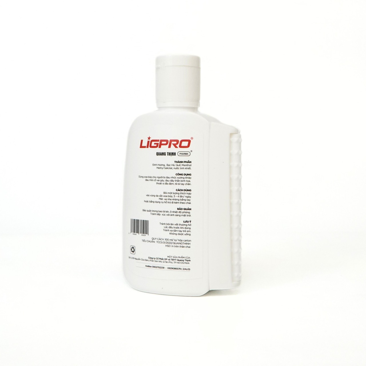 Gel nóng xoa bóp Ligpro, chai 100ml ( tặng kèm theo con lăn massa) Thành phần: Đinh hương, bạc hà, quế, menthol, Methyl salycilat, nước tinh khiết Công dụng: