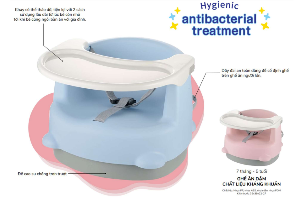 GHẾ ĂN DẶM RICHELL CHẤT LIỆU KHÁNG KHUẨN Chất liệu nhựa kháng khuẩn an toàn khi sử dung tiếp xúc với thực phẩm, thức ăn cho bé.Thành phần: Nhựa PP (nhựa số 5), ABS, TPE, POM, Polyester.Chất liệu g...