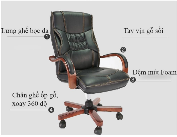 • Mặt ngồi: Đệm và lưng bọc da công nghiệp, tay gỗ tự nhiên sơn PU bóng bọc da công nghiệp. Chân ghế: Chân xoay gỗ tự nhiên sơn PU bóng, bánh xoay 360 độ