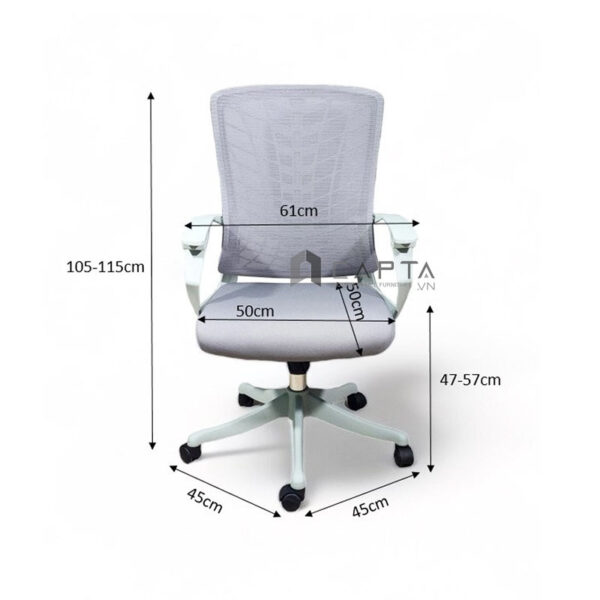 Kích thước: W49-58 x D47 x H92-104 cm (Cao tổng). H từ ngồi đến lưng: 48 cm, H Tay: 64-76 cm, H đất-ngồi: 48-60 cm (Lúc Ben thấp – Ben cao) Chất liệu: lưng rời,