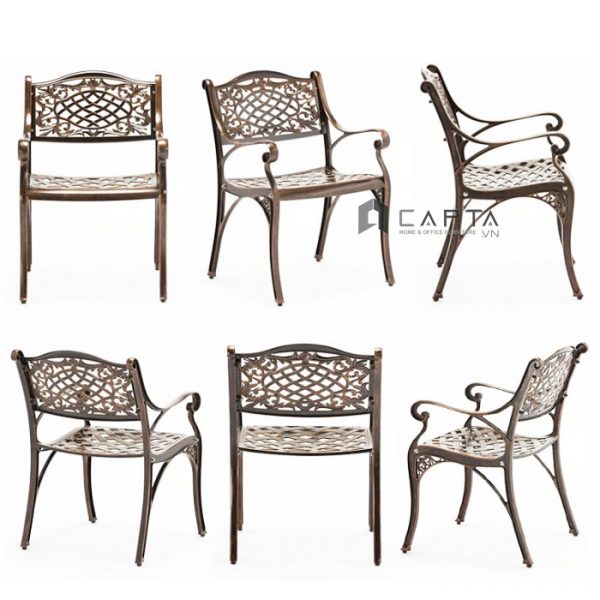 Ghế Cafe sân vườn nhôm đúc màu đồng CC2017-A Nội thất Capta Ghế ngoài trời có tay tựa thân ghế hình bông sen - Chất liệu: nhôm đúc sơn tĩnh điện màu đồng - Thiết