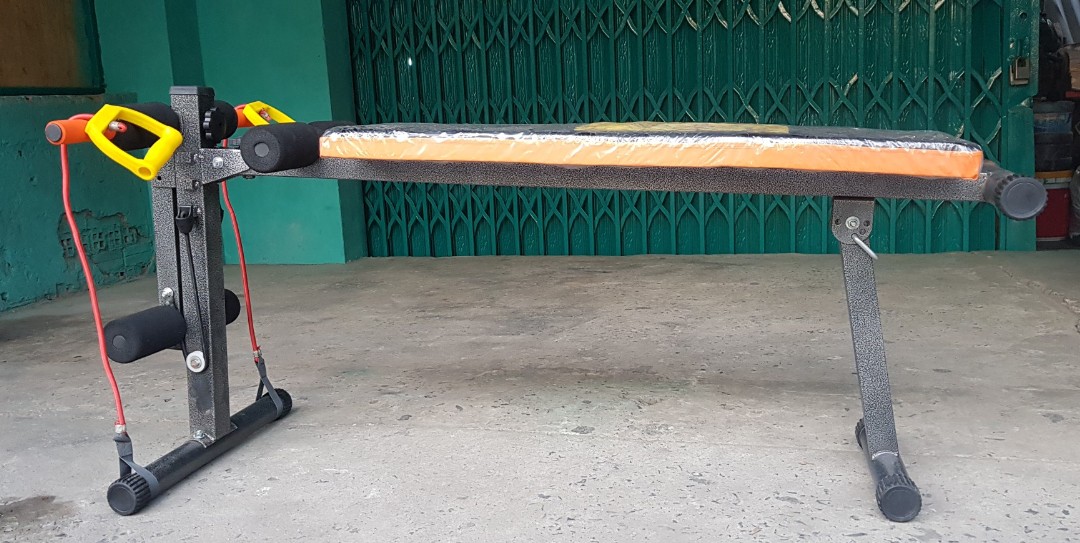 • HƯỚNG DẪN SỬ DỤNG 1/ Tập bụng trên: Ngồi vào ghế như hình móc 2 chân vào đệm cao su, nằm thẳng người xuống, hít hơi vào dùng sức nâng người lên lúc này thở ra. Ngồi như tư thế trên, khi xuống kết hợp vặn người sang trái (hoặc phải) để tập eo. 2/ Tập bụng dươi: Nằm ngửa, 2 tay bám vào đệm cao su, 2 chân duỗi thẳng nâng lên cao, thóp bụng, hít hơi vào lại rồi hạ xuống từ từ không chạm đất, lúc này thở ra . Rồi lập lại như trên nhiều lần. 3/ Tập vai tay trước: Ngồi móc chân vào đệm cao su, hai tay nắm đầu dây, kéo căng lực dây ra 2 bên, lập đi lập lại nhiều lần. 4/ Tập hít đât: Hai tay nắm vào đầu mút. Người ngã về hướng ghê, hai khuỷu tay gấp lại đồng thời hít vào. Dùng lực cổ tay, cánh tay, đẩy thân người nhô lên, thở ra. Lập lại nhiều lần. 5/ Tập ngực trên Ghế với tạ: Nằm ngữa trên ghế: 2 chân móc vào cao su, 2 tay nâng tạ lên cao, tập ngực và tay sau. 6/ Tập cơ lưng tư thế nằm sấp: Nằm sấp 2 chân cài vào đệm cao su, 2 tay đặt sau gáy, nâng người lên. Tập cơ lưng khòe dẻo dai.
