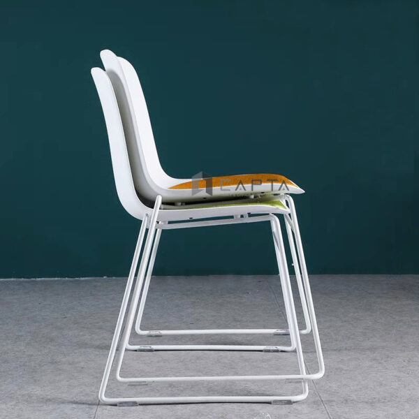 Ghế thân nhựa chân sắt vòng có thể xếp chồng lên nhau tiện lợi, tiết kiệm không gian.