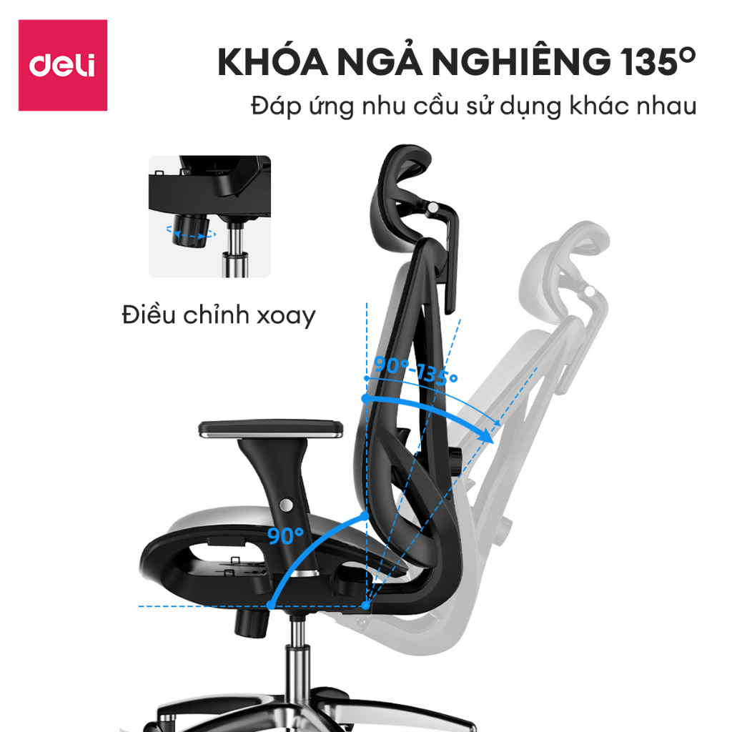 ✨Ghế Xoay Văn Phòng Công Thái Học Cao Cấp Có Khóa Ngả Lưng 135 Độ Có Tùy Chỉnh Tựa Tay, Tựa Cổ Deli Hỗ Trợ Đốt Sống Cổ Tối Ưu Tư Thế Ngồi - Ghế Giám Đốc Bảo Hành 3 Năm