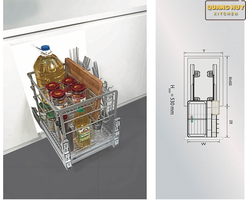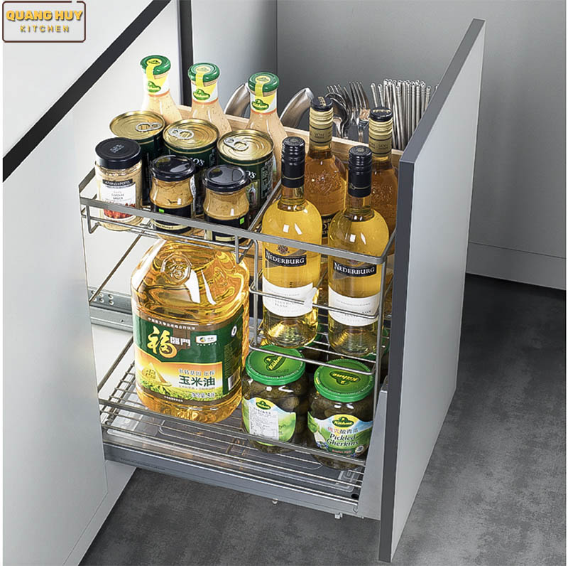 Giá đa năng để giao thớt, chai lọ, gia vị Chất liệu: Inox 304 dạng nan tròn Phiên bản bắt cánh ngăn kéo và mở cánh Ray âm giảm chấn Angas Độ rộng cánh: 300mm