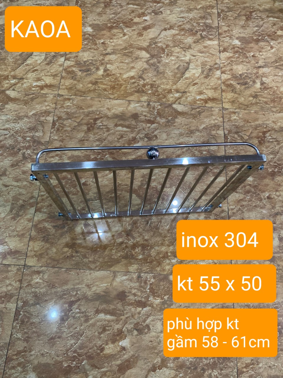 - / kích thước giá. rộng x sâu . 55 x 50 cm 3./ sp được thiết kế thông minh với 4 bulong 2 bên rễ dàng tăng chỉnh linh hoạt theo kích thước dao động cho phép 4./ công năng . sử dụng chủ yếu xoong nồi . bát đĩa . rổ giá các vận dụng nhà bếp vv 5./ khoảng cách nan phi 4cm LƯU Ý BẮT BUỘC ... kích thước giá rộng 55cm sẽ phù hợp với kích thước lắp đặt dao động từ 58 - 61cm ƯU ĐIỂM.. ́ inox nhà bếp thông minh (KAOA) có thể rễ dàng tháo .lắp linh hoạt mỗi khi vệ sinh không gian phòng bếp cách lắp đặt đơn giản không cần thợ