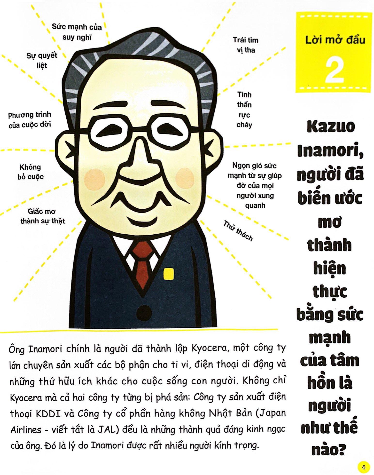 Ông Inamori chính là người đã thành lập Kyocera, một công ty lớn chuyên sản xuất các bộ phận cho tivi, điện thoại di động và những thứ hữu ích khác cho cuộc sống con người. Không chỉ Kyocera mà cả hai công ty từng bị phá sản: Công ty sản xuất điện thoại KDDI và Công ty cổ phần hàng không Nhật Bản (Japan Airlines) đều là những thành quả đáng kinh ngạc của ông.