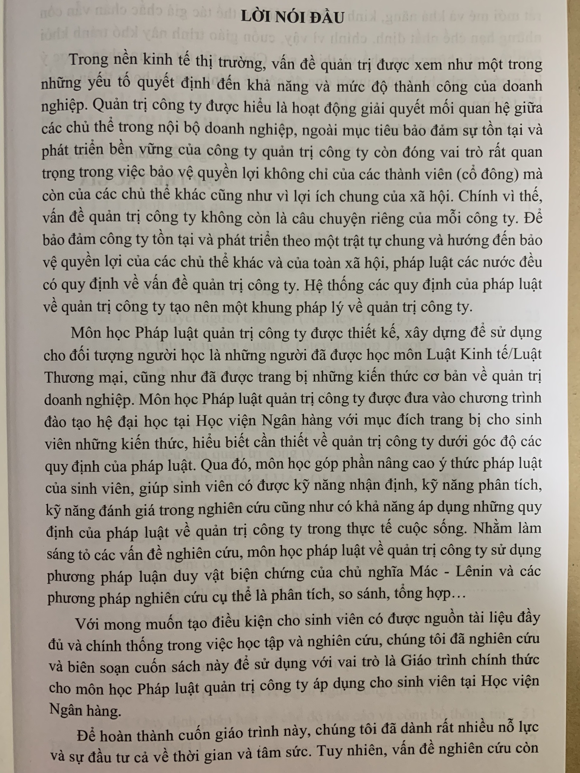 Với mong muốn tạo điều kiện cho sinh viên có được nguồn tài liệu đầy đủ và chính thống trong việc học tập và nghiên cứu, chúng tôi đã nghiên cứu và biên soạn cuốn sách này để sử dụng với vai trò là Giáo trình chính thức cho môn học Pháp luật quản trị công ty áp dụng cho sinh viên tại Học viện Ngân hàng.