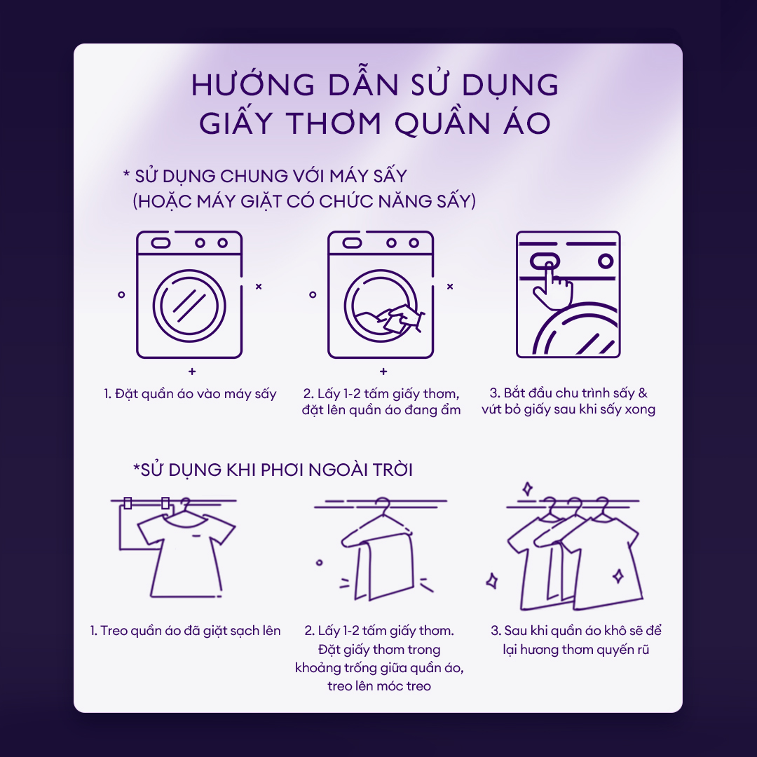 - Giấy sấy thơm quần áo Arfum dùng được cho cả quá trình sấy và phơi quần áo.