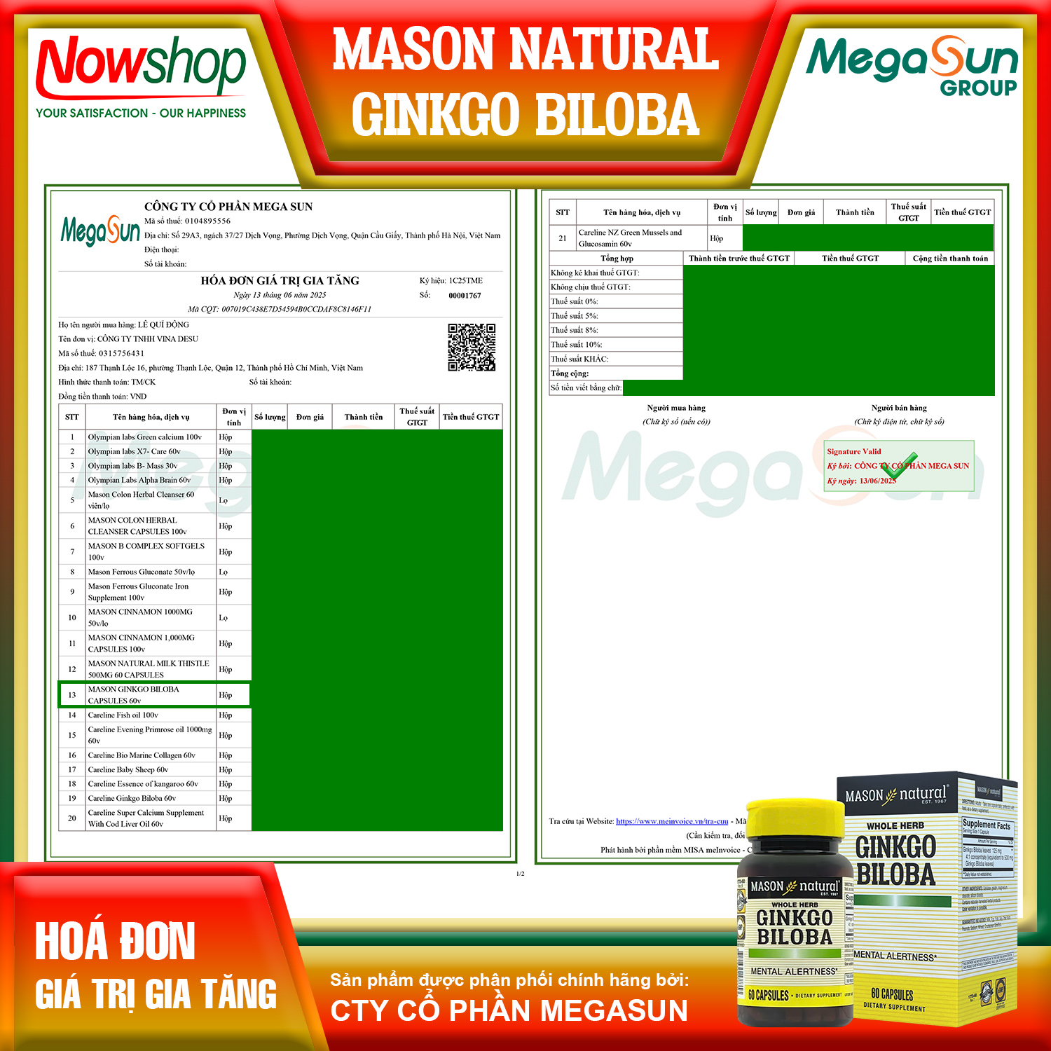 Viên Uống Bổ Não Mason Ginkgo Biloba - Tăng Cường Trí Nhớ, Tuần Hoàn Máu Não Minh mẫn mỗi ngày - Tự tin học tập & làm việc hiệu quả Chiết xuất Ginkgo Biloba 125mg