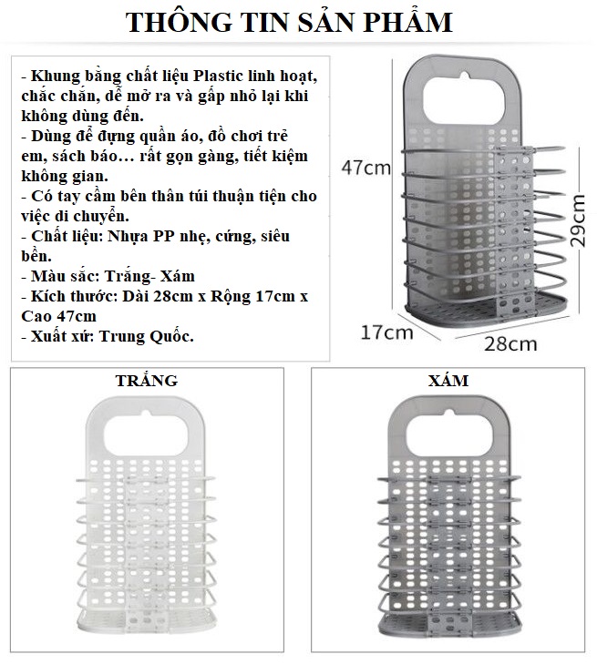 giỏ đựng quần áo Sản phẩm : giỏ đựng quần áo treo tường Chất liệu : Nhựa dẻo Màu sắc : trắng, xám (giao màu ngẫu nhiên) Ưu điểm- Có thể gấp gọn , gắn tường tiện