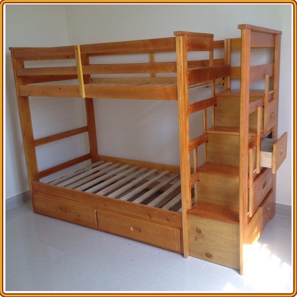 + Chất liệu: Khung giường gỗ thông Newzealand, phân tầng, Vách, đáy hộc gỗ công nghiệp, thang giường MDF chịu lực + Kích thước: kích thước phủ bì, tầng trên ưới 1mx2m Giường tầng hộp
