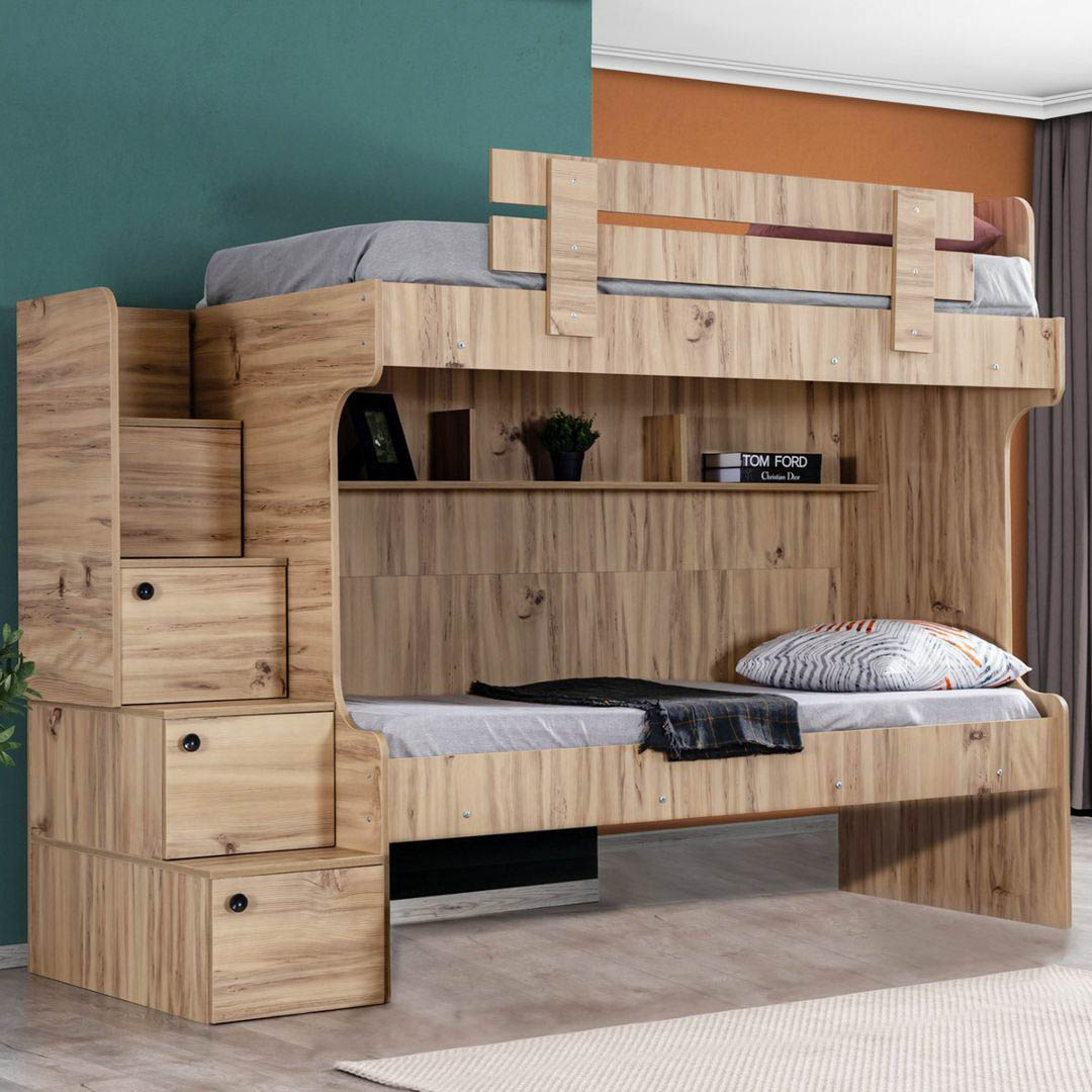 Giường tầng xuất khẩu Derby có kích thước lọt lòng giường trên/dưới là 100x193 cm / 120 x 193 cm, phủ bì 206x128x178 cm. Khoảng cách giữa 2 tầng là 98 cm, cầu thang có