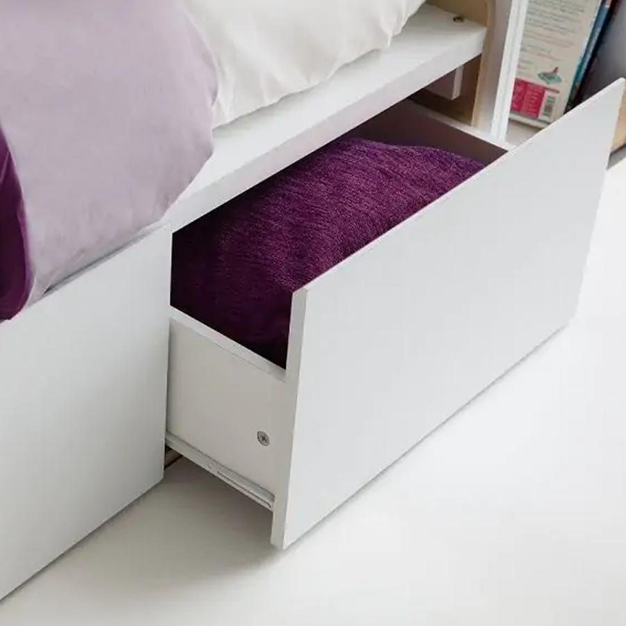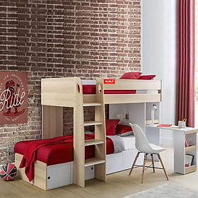 - Đặc biệt, tầng dưới của giường còn được bố trí thêm một chiếc kệ 3 ngăn để bé đặt sách truyện, đồng hồ hay trang trí gấu bông, đồ chơi theo sở thích của mình. Ngoài ra, sản phẩm được trau chuốt về góc cạnh – Giúp an toàn cho trẻ nhỏ, giúp Bạn và gia đình luôn cảm thấy thoải mái khi ngủ.