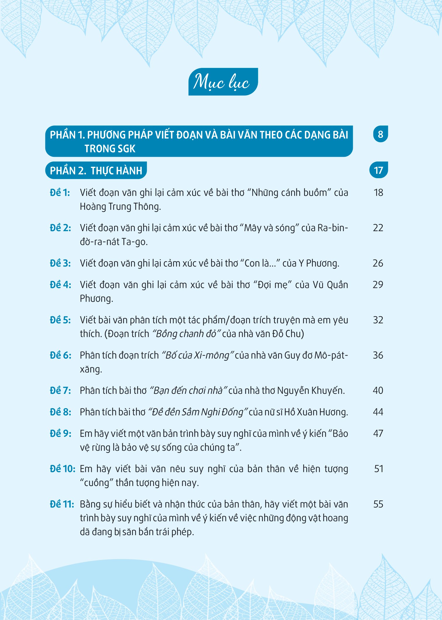 - Thực hành: gồm một số đề bài tham khảo gồm hướng dẫn làm bài, gợi ý nhan đề, gợi ý dàn bài và bài văn mẫu tham khảo nhằm hướng dẫn học sinh luyện kĩ năng Viết một cách thành thạo.