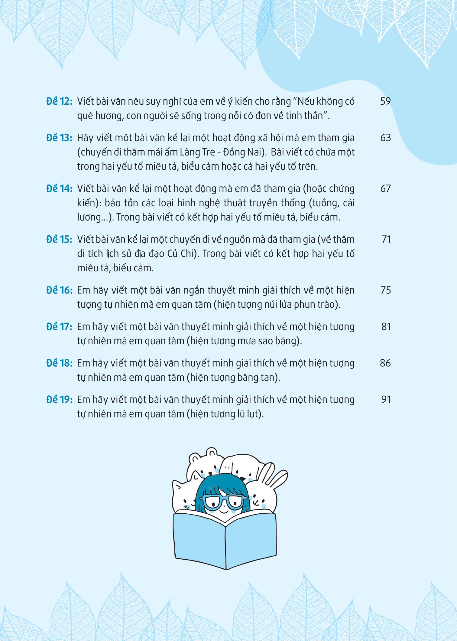- Gồm 20 đề bám sát chương trình học: cấu trúc gồm hướng dẫn làm bài, gợi ý nhan đề, gợi ý dàn bài và bài văn mẫu tham khảo nhằm hướng dẫn học sinh luyện kĩ năng viết một cách thành thạo.