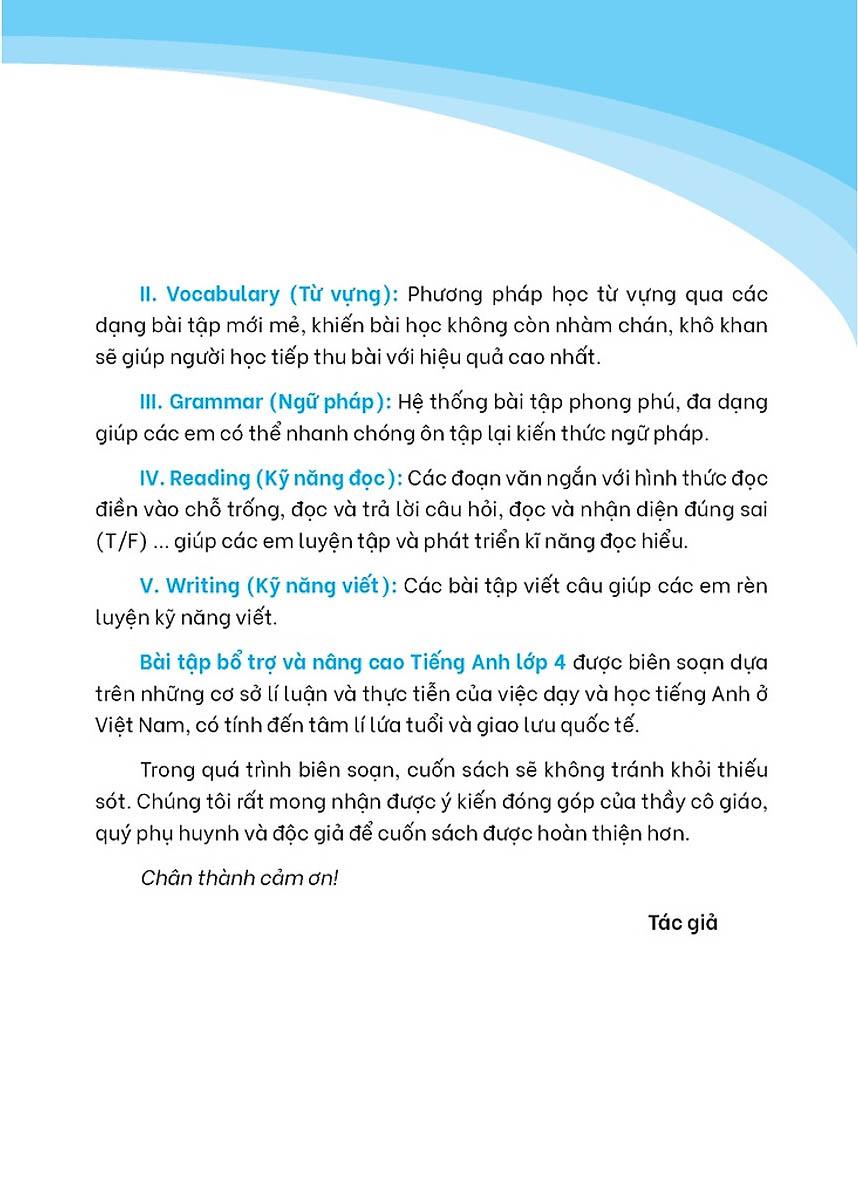 Bài tập bổ trợ và nâng cao Tiếng Anh được chia thành các đơn vị bài học bám sát chương trình mới nhất của Bộ Giáo dục và Đào tạo. Thông qua hệ thống các bài học với kiến thức bổ trợ nâng cao, cuốn sách hướng tới phát triển toàn diện kỹ năng ngôn ngữ cho các em học sinh. Đây không chỉ là tài liệu bổ trợ giúp các em củng cố kiến thức cơ bản sau các bài học trên lớp mà còn là công cụ hỗ trợ các em không ngừng mở rộng và nâng cao kiến thức.