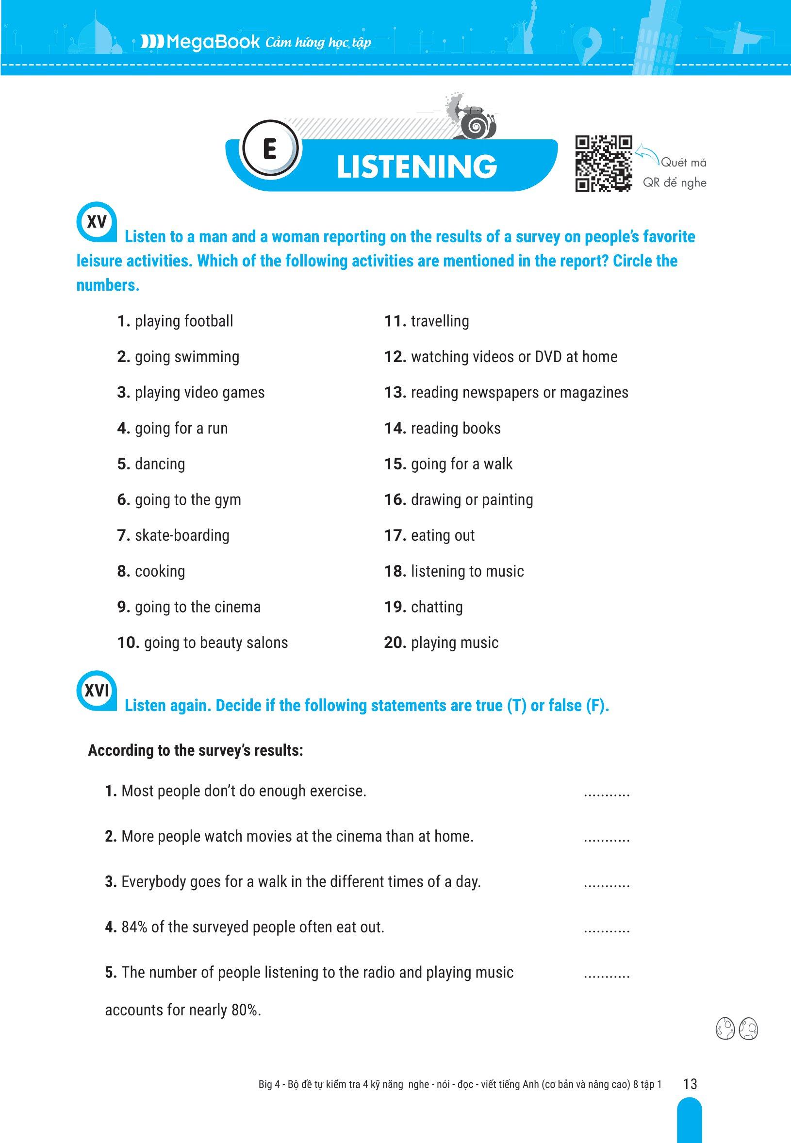 Các bài tập về 4 kỹ năng được liên kết với nhau theo logic bài học giúp cảm em cảm thấy tự tin và phát triển toàn diện kỹ năng nghe, nói, đọc, viết tiếng Anh
