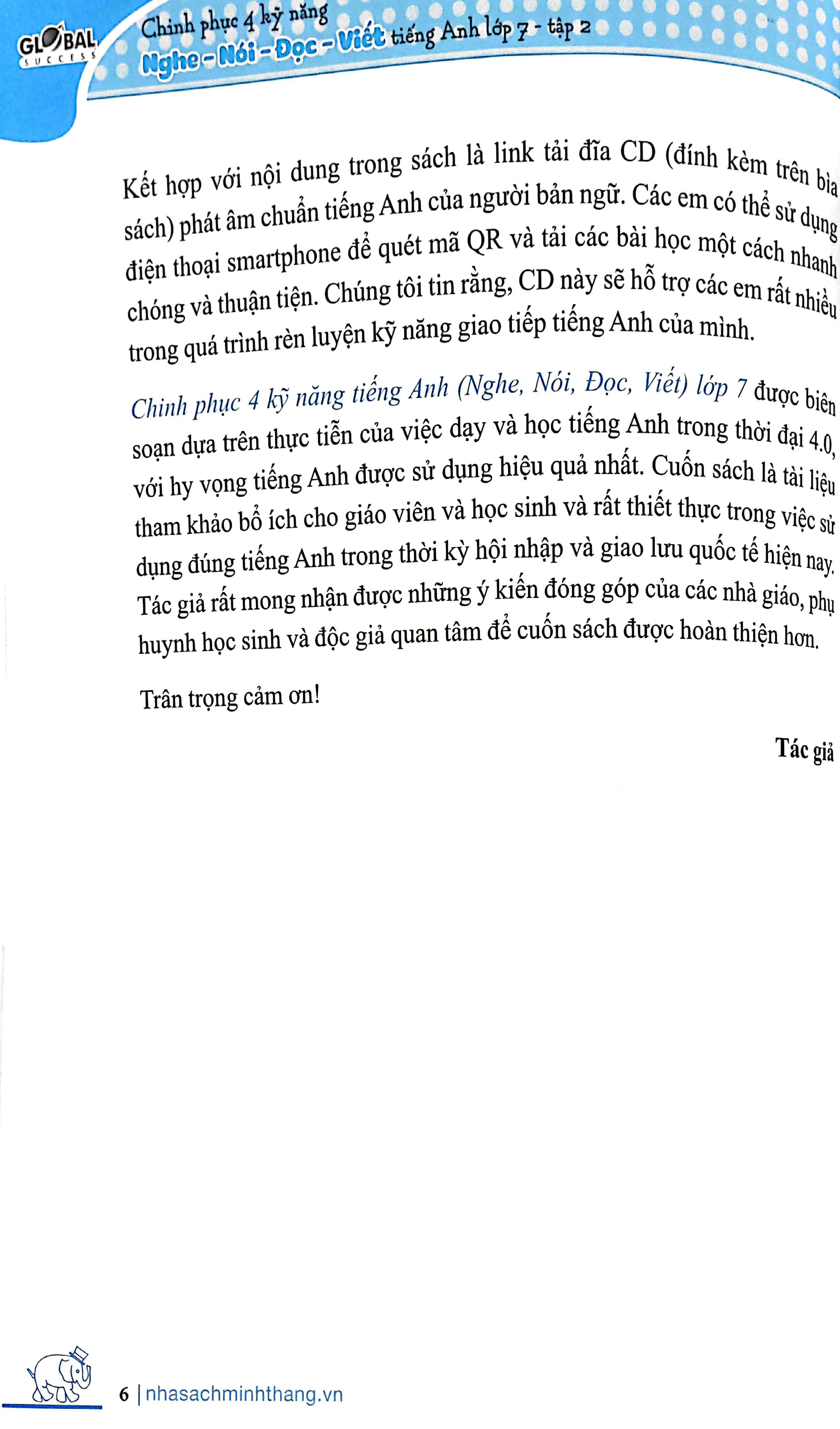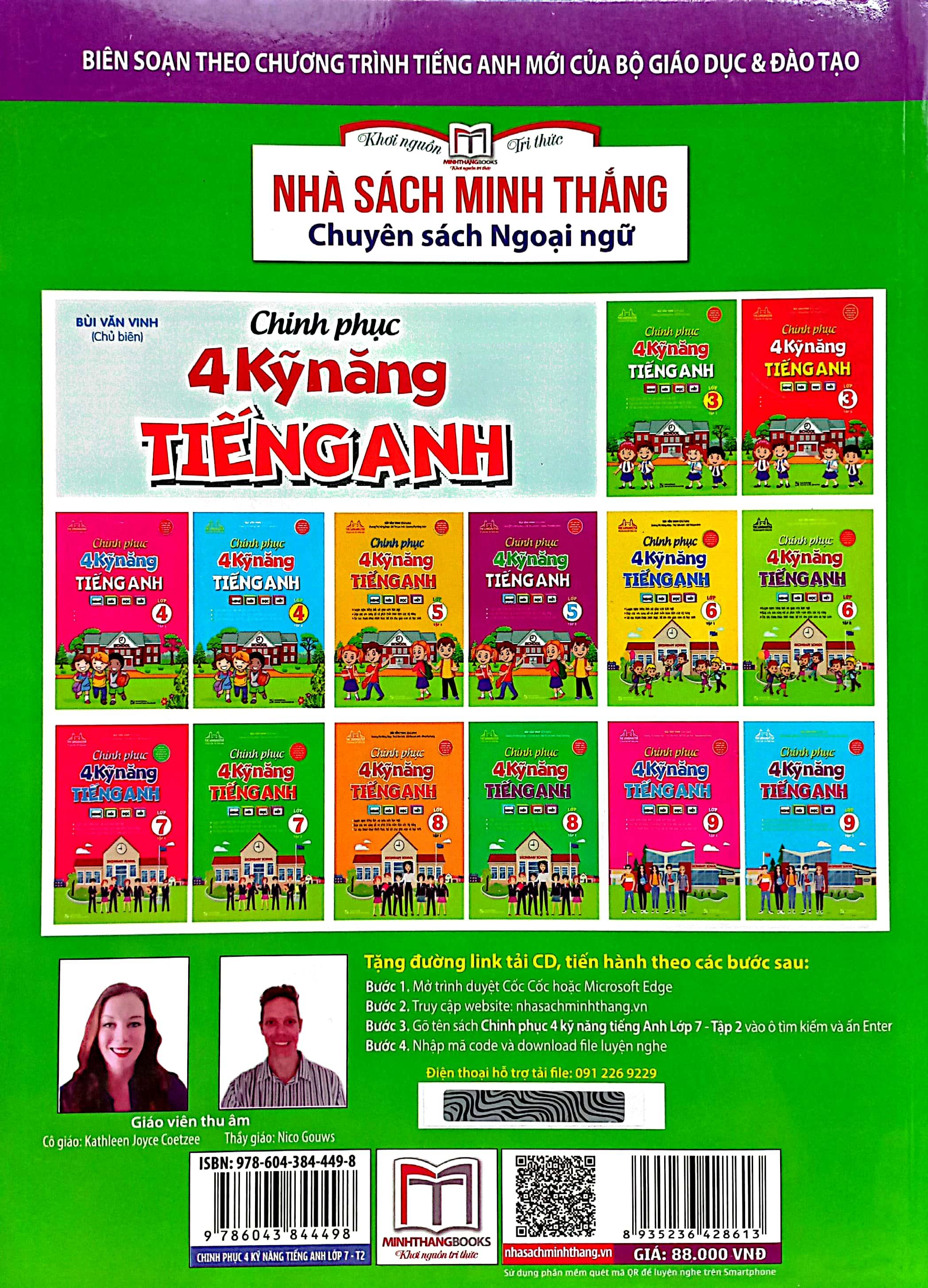 Cuốn sách Chinh phục 4 kỹ năng tiếng Anh (Nghe, Nói, Đọc, Viết) lớp 7 được biên soạn dành cho học sinh lớp 7, dựa trên sách giáo khoa Global Success của Bộ Giáo dục và Đào tạo. Sách tập trung vào việc rèn luyện các kỹ năng cơ bản như: Nghe, Nói, Đọc, Viết thông qua các bài tập và phát triển các kỹ năng giao tiếp tổng hợp về cách phát âm đúng, từ vựng phong phú; đọc các đoạn hội thoại, đoạn văn; viết câu hoặc đoạn văn theo mẫu, nói theo chủ đề từng bài học, nhằm giúp các em học sinh vận dụng và tổng hợp kiến thức hiệu quả nhất.