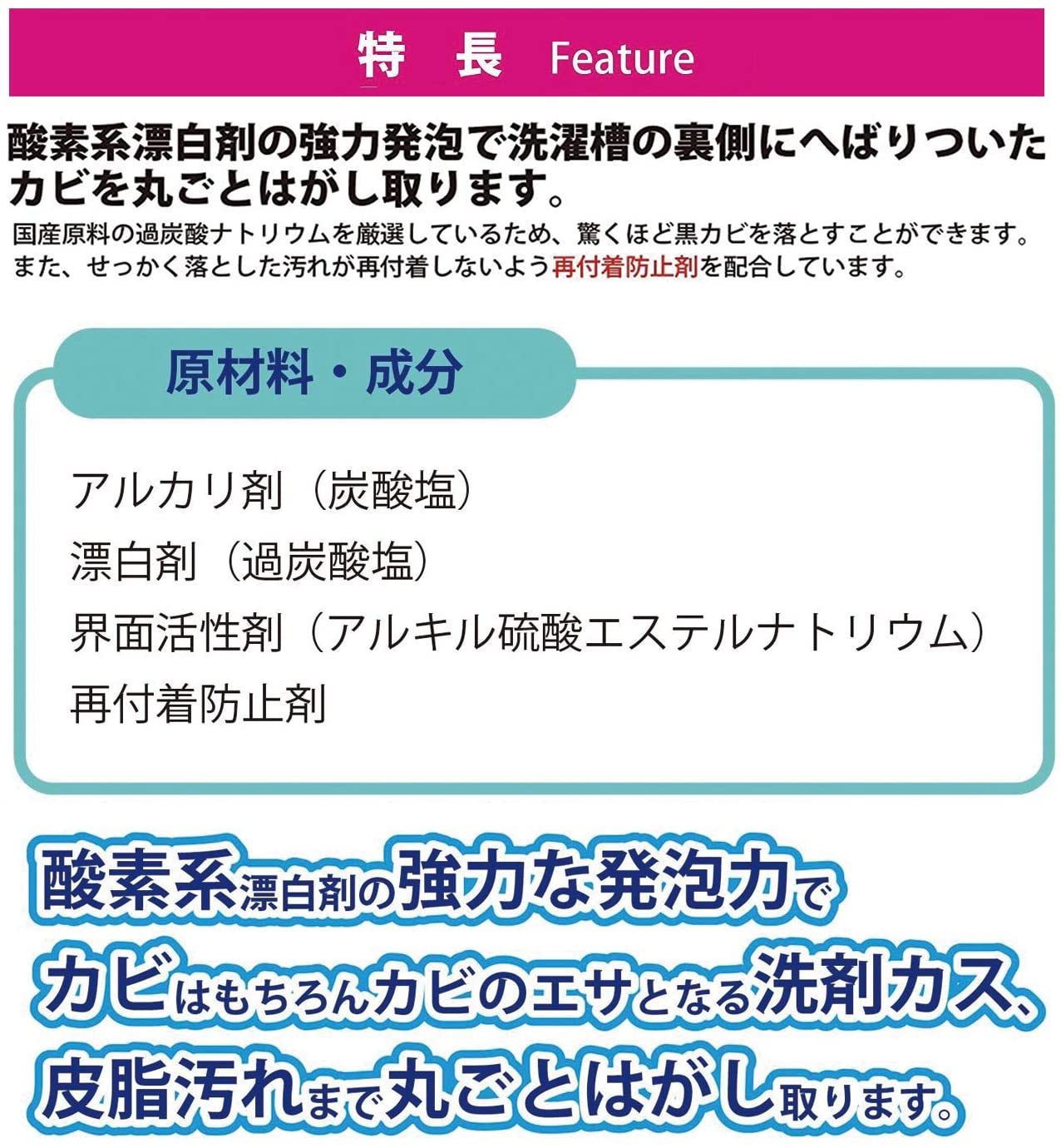 Bột tẩy rửa, khử khuẩn lồng máy giặt sinh học cực mạnh , không chứa Clo 750gr - Nội địa Nhật Bản: * Thành phần: Kiềm, chất tẩy trắng, chất hoạt động bề mặt, *