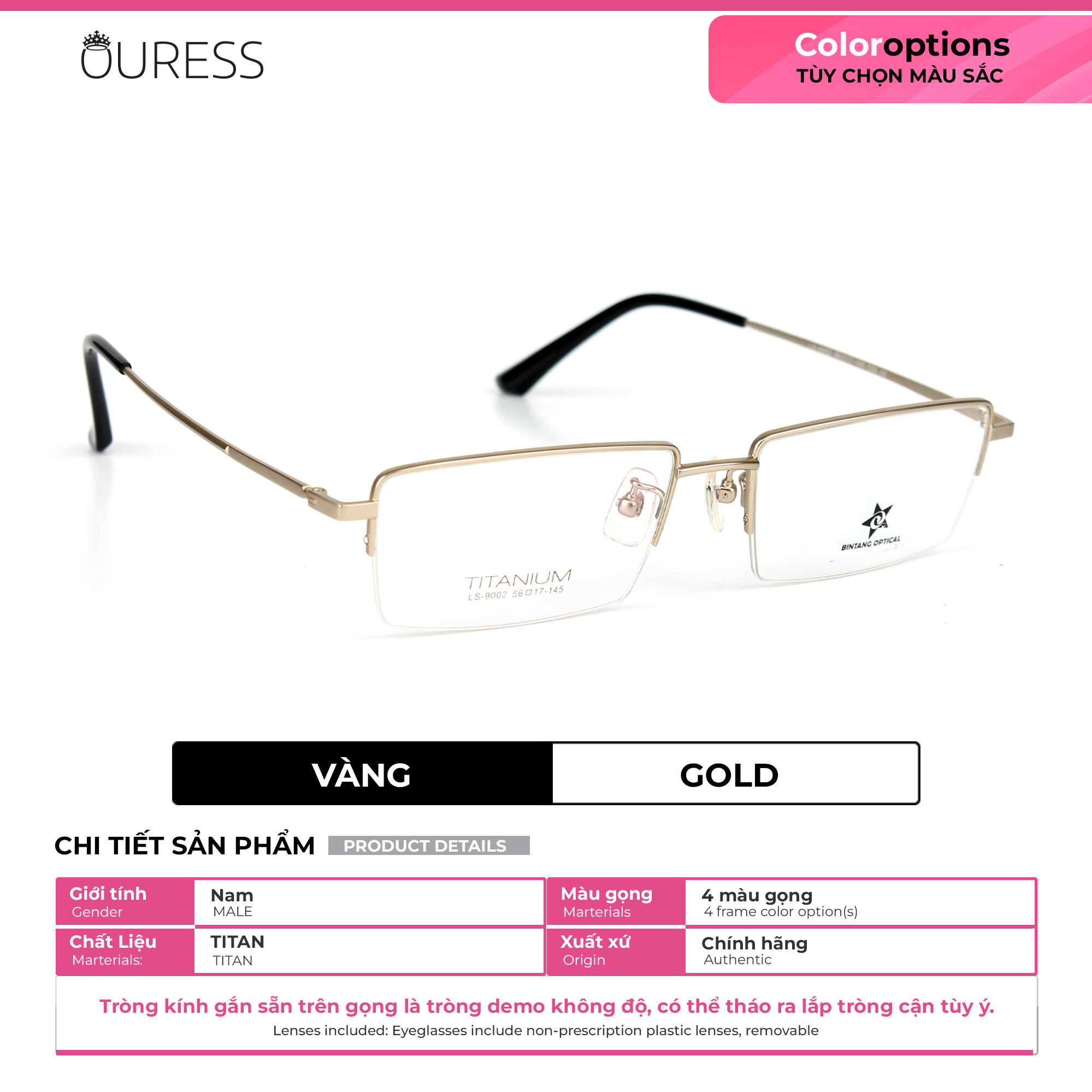 MÔ TẢ CHI TIẾT SẢN PHẨM: -tròng kính thủy tinh sản xuất tại đức - Form kính : vuông - Màu sắc: Vàng - độ từ +0.5- +4.0 - Gọng kiếng đường nét tinh xảo