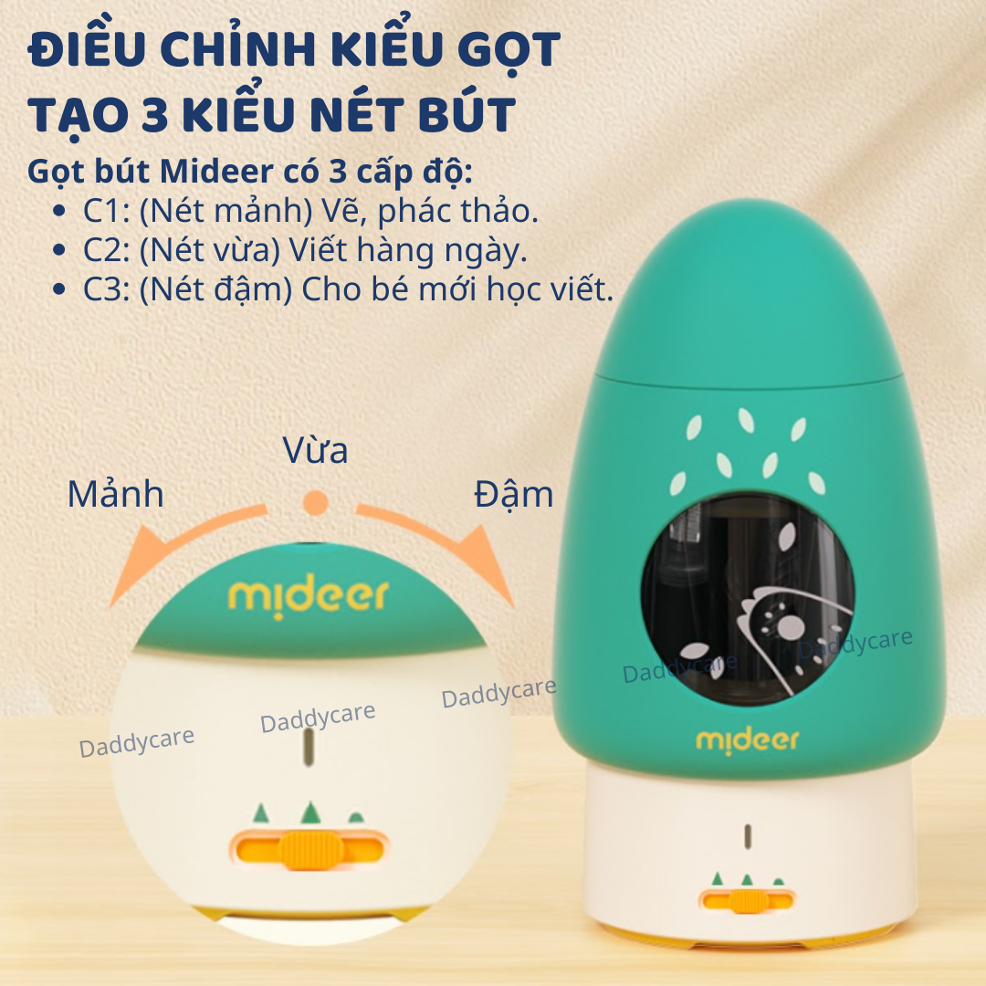 Với 3 cấp độ điều chỉnh, gọt bút chì tự động Mideer phù hợp với mọi thói quen viết và mục đích sử dụng của trẻ: