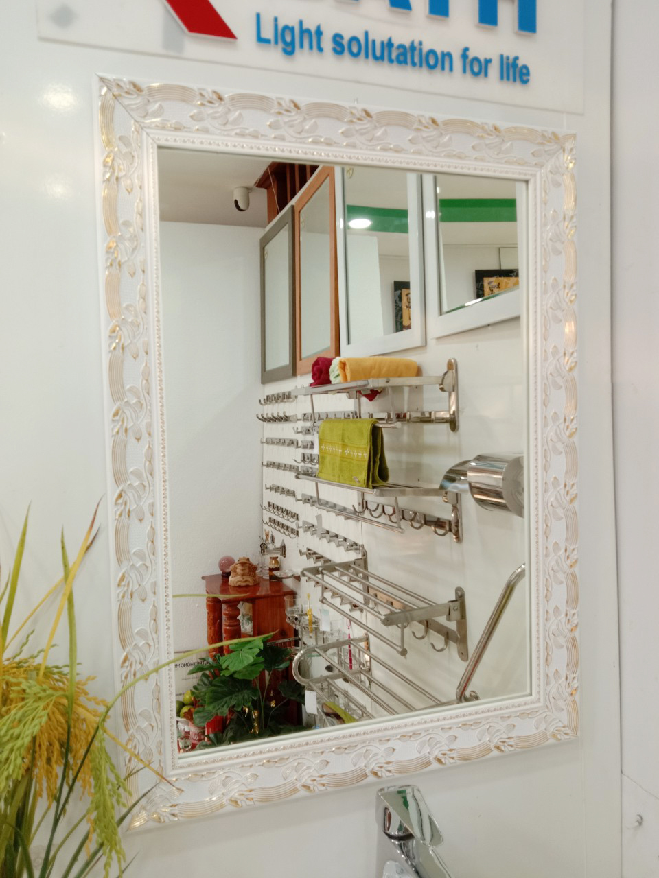 ✨Gương soi Kibath khung màu trắng bảng 6 phân họa tiết vàng KT 60x80 cm, KB-129