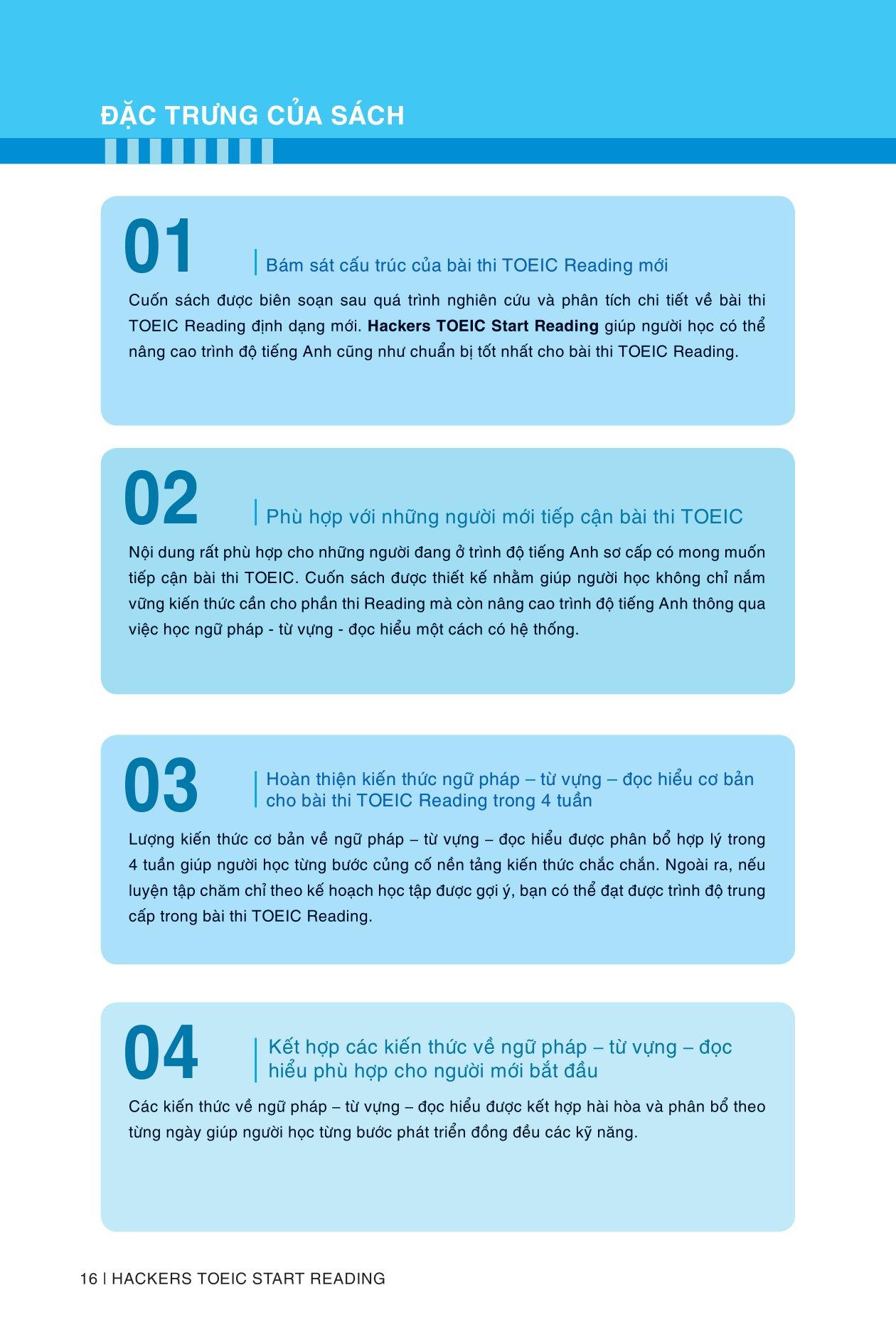 Hackers TOEIC Start Reading giúp người mới bắt đầu thiết lập một “nền tảng tiếng Anh thông qua TOEIC”. Tuy nhiên, người học ở trình độ khác cũng có thể khai thác hiệu quả giáo trình này. Phù hợp với người học đang đặt mục tiêu TOEIC là 450-650 điểm.