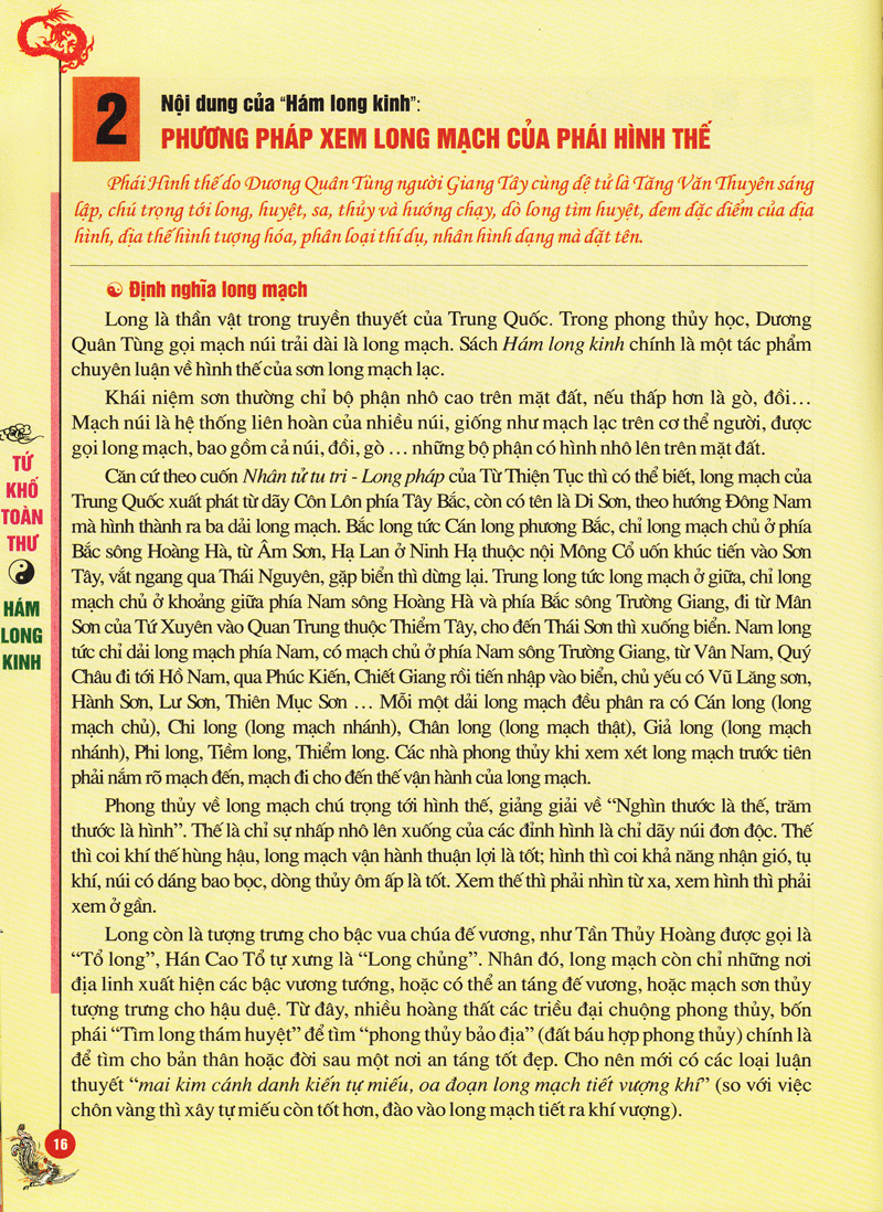 Cuốn sách giới thiệu về các loại long mạch ở rừng núi, thành thị, đồng bằng. Cuốn sách lấy “Hám long kinh” của Dương Quân Tùng làm bản chính, thêm vào các thiên gần gũi cũng bàn về long mạch của phái phong thủy là “Nghi long kinh” và “Táng pháp đảo trượng”, dùng thủ pháp biên tập hiện đại như minh họa, đồ biểu, đồ giải để tiến hành trình bày, giải thích một cách sinh động nguyên bản. N