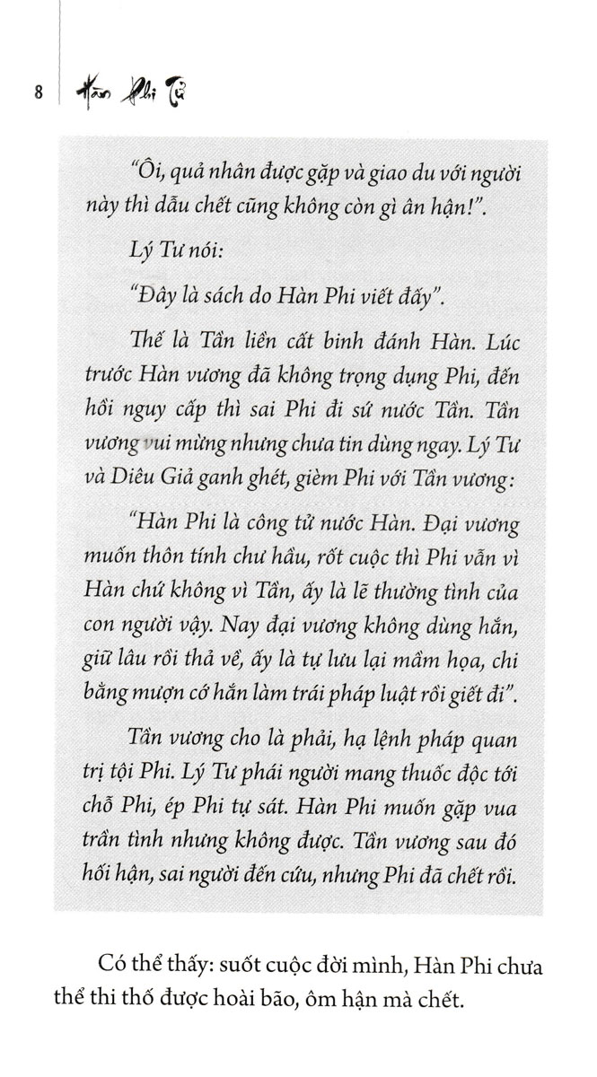 Sách Hàn Phi Tử không chỉ xuất phát từ những tư tưởng tiến bộ về phép trị nước ngày xưa mà còn mở rộng ra là những triết lý nhân sinh mà chúng ta có thể áp dụng vào đời sống ngày nay.