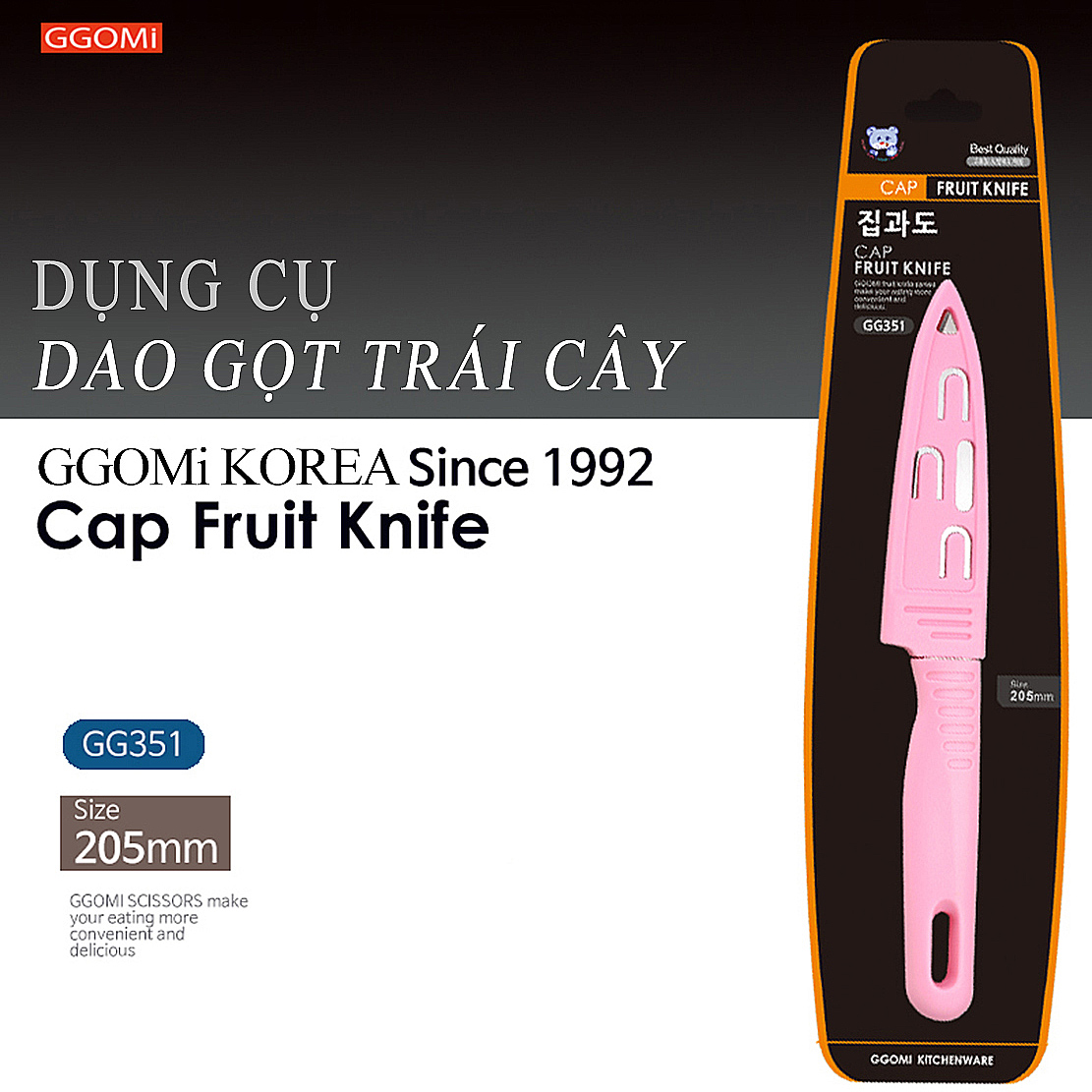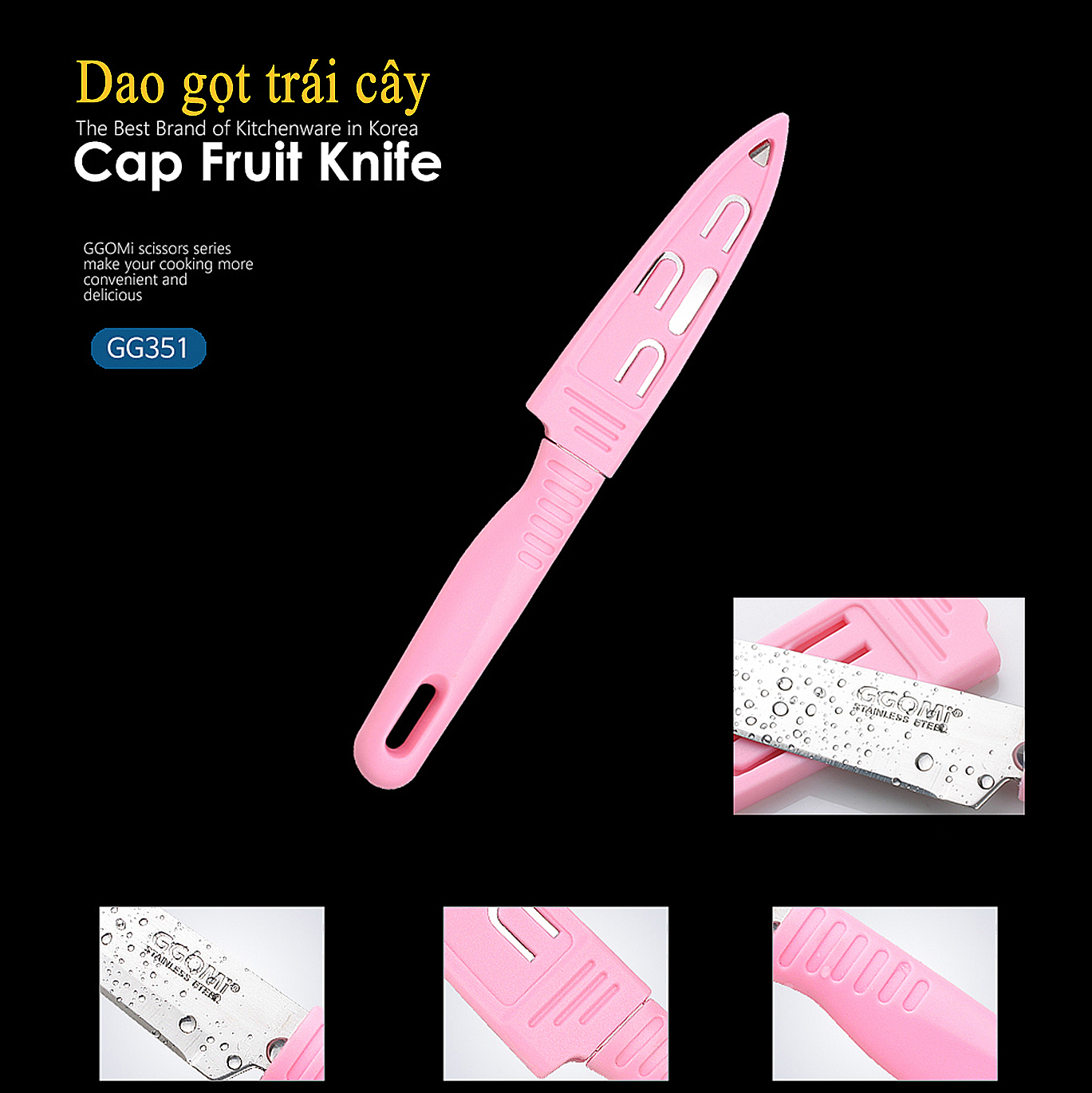 Dao gọt trái cây có nắp bảo vệ GGOMi Hàn Quốc GG351 có tay cầm và nắp bảo vệ bằng nhựa ABS tiện lợi và an toàn khi sử dụng, trên lưỡi dao được thiết kế dập nổi và in logo thương hiệu GGOMi tránh hàng nhái, hàng giả, lưỡi dao được sử dụng bằng vật liệu thép không gỉ an toàn với sức khỏe của con người khi sử dụng sản phẩm. Sản phẩm có nhiều màu sắc cho bạn lựa chọn
