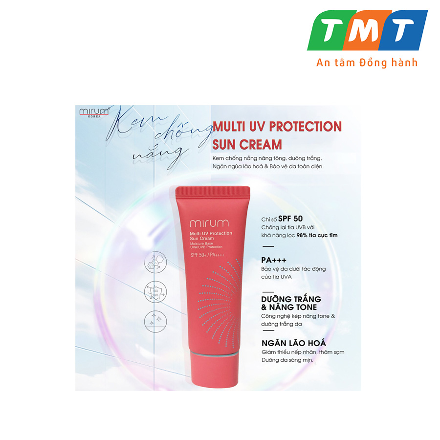 Kem chống nắng nâng tông, dưỡng trắng, ngừa lão hóa và bảo vệ da toàn diện Mirum 50ml – Mirum Multi UV Protection Sun Cream SPF 50+/PA+++ THÔNG TIN SẢN PHẨM Kem chống nắng nâng tông, dưỡng trắng, ngừa lão hoá và bảo vệ da toàn diện Mirum 50ml