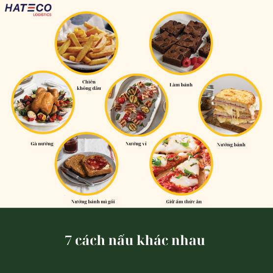 - Sản phẩm lò chiên không dầu này có 7 chương trình cài đặt sẵn, bao gồm: chiên không dầu, quay, nướng, nướng vỉ, nướng bánh mì, nướng bánh mì và giữ ấm. Tiện ích