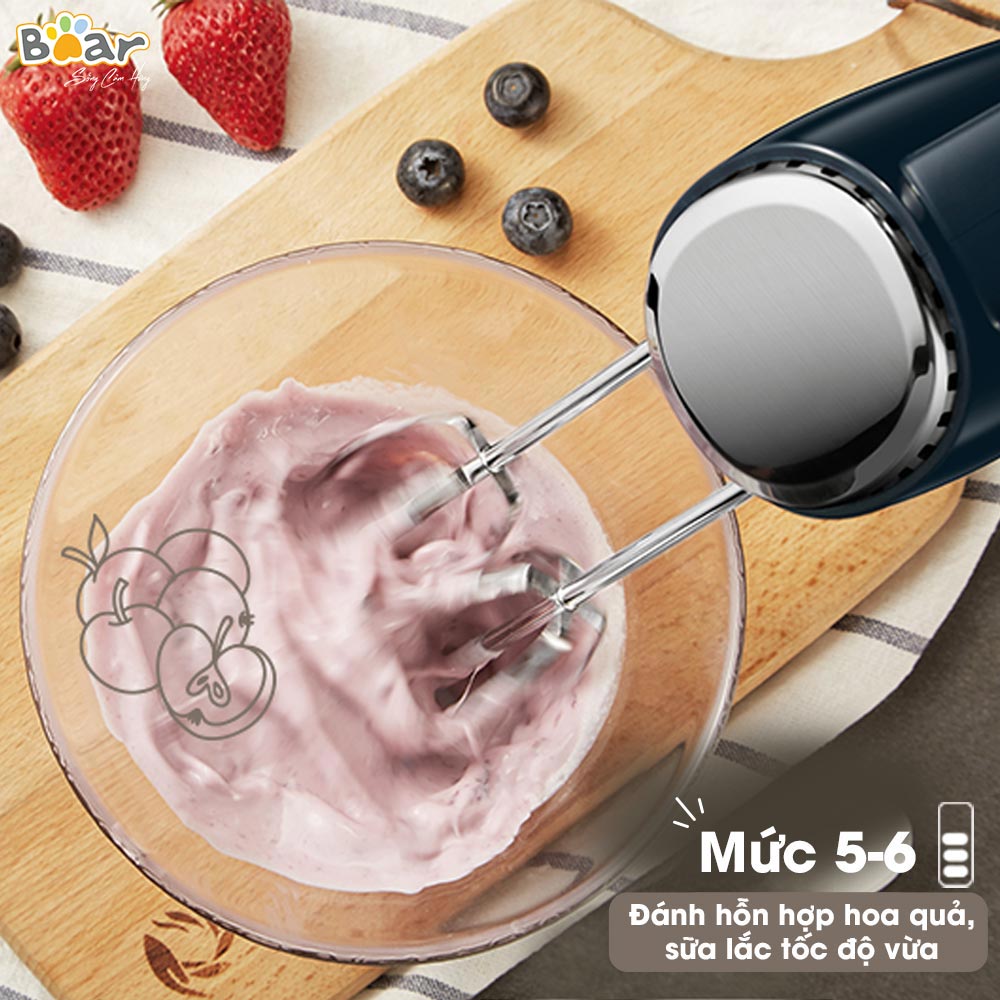 1. Máy đánh trứng cầm tay, trộn bột Bear - Đánh trứng bông xốp, trộn bột kéo màng Được tích hợp 2 tính năng: đánh trứng - trộn bột, kết hợp với công suất 300W mạnh mẽ và 10 tốc độ đánh, trộn khác nhau, máy đánh trứng cầm tay Bear DDQ-B02L1 (HM-B01V1) thực hiện tốt chức năng đánh bông kem tươi, lòng trắng trứng, bơ và nhào bột đạt chuẩn. 10 tốc độ đánh, trộn khác nhau, cho phép bạn tăng dần tốc độ đánh, trộn để cho ra các thành phẩm hoàn hảo nhất.   Sản phẩm được tích hợp đến 10 tốc độ đánh khác nhau từ mạnh đến nhẹ cho bạn dễ dàng tùy chỉnh. Cụm điều chỉnh tốc độ có thanh gạt nấc 1 và 2 dễ sử dụng. Khi chọn nấc 1 tốc độ tương ứng từ mức 1 - mức 5 thích hợp đánh bông kem trứng và các loại bột lỏng, hỗn hợp hoa quả kem sữa. Khi chọn nấc 2 tốc độ từ 1 - 5 sẽ tương ứng thành tốc độ từ mức 6 - 10 giúp bạn đánh và trộn các loại bột có kết cấu đặc hơn, đánh bông bơ và kem trứng.