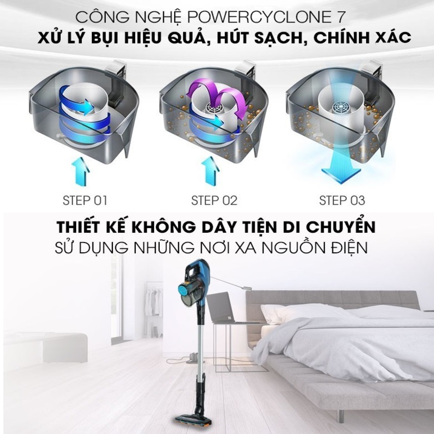- Công nghệ PowerCyclone 7 tách bụi khỏi không khí ngay tức thì, giúp duy trì hiệu suất mạnh mẽ trong thời gian lâu hơn. Thiết kế túi chứa bụi độc đáo cho phép trút sạch bụi mà không tạo ra đám mây bụi
