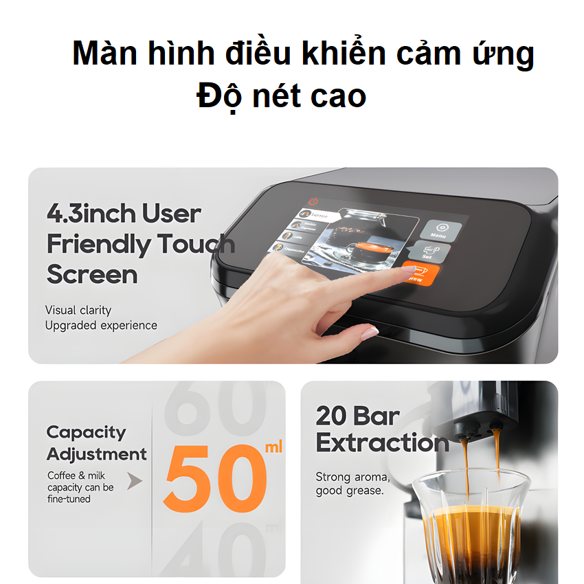 - Chỉ cần chạm và click, mọi thông số: khối lượng, độ mịn cà phê sẽ được lưu lại dành cho lần pha chế tiếp theo luôn hoàn hảo. Tất cả thao tác thực hiện trên màn hình cảm ứng 4.3 inch dễ dàng.