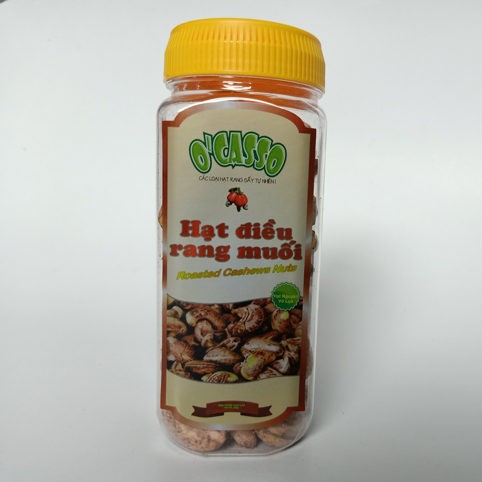 Hạt Điều Rang Muối  loại Cồ O’Casso   Hạt điều lụa rang muối loại cồ O’Casso là sản phẩm gần đây được nhiều người tiêu dùng ưa chuộng bởi thân hình to mẩy khiêu khích người dùng. Mỗi dịp lễ tết hay mua quà biếu tặng, ai ai cũng dễ dàng quyết định bởi sự quyến rũ của ngoại hình hạt điều to mẩy đẹp hút mắt với độ giòn tan béo bùi thơm ngon từng hạt.   Nine Stars đã nghiên cứu rất kỹ nguyên liệu hạt điều trước khi cho chế biến. Mỗi loại điều, giống điều hay vùng trồng cũng cho ra chất lượng hạt điều khác nhau, nên việc am hiểu nguyên liệu hạt điều là điều kiện rất cần thiết cho sản phẩm chế biến hạt điều nguyên. Sản phẩm hạt điều lụa rang muối loại cồ O’Casso có độ chắc hạt,  to mẩy, béo thơm, giòn tan, cực kỳ dễ bóc vỏ.   Thông tin sản phẩm Thành phần  : Hạt điều 90%, muối i-ốt 10% Hướng dẫn bảo quản: bảo quản nơi khô ráo, thoáng mát, tránh ánh nắng trực tiếp Hướng dẫn sử dụng : dùng ngay sau khi mở bao bì Giữ kín bao bì khi không sử dụng Hạn sử dụng 12 Tháng kể từ ngày sản xuất