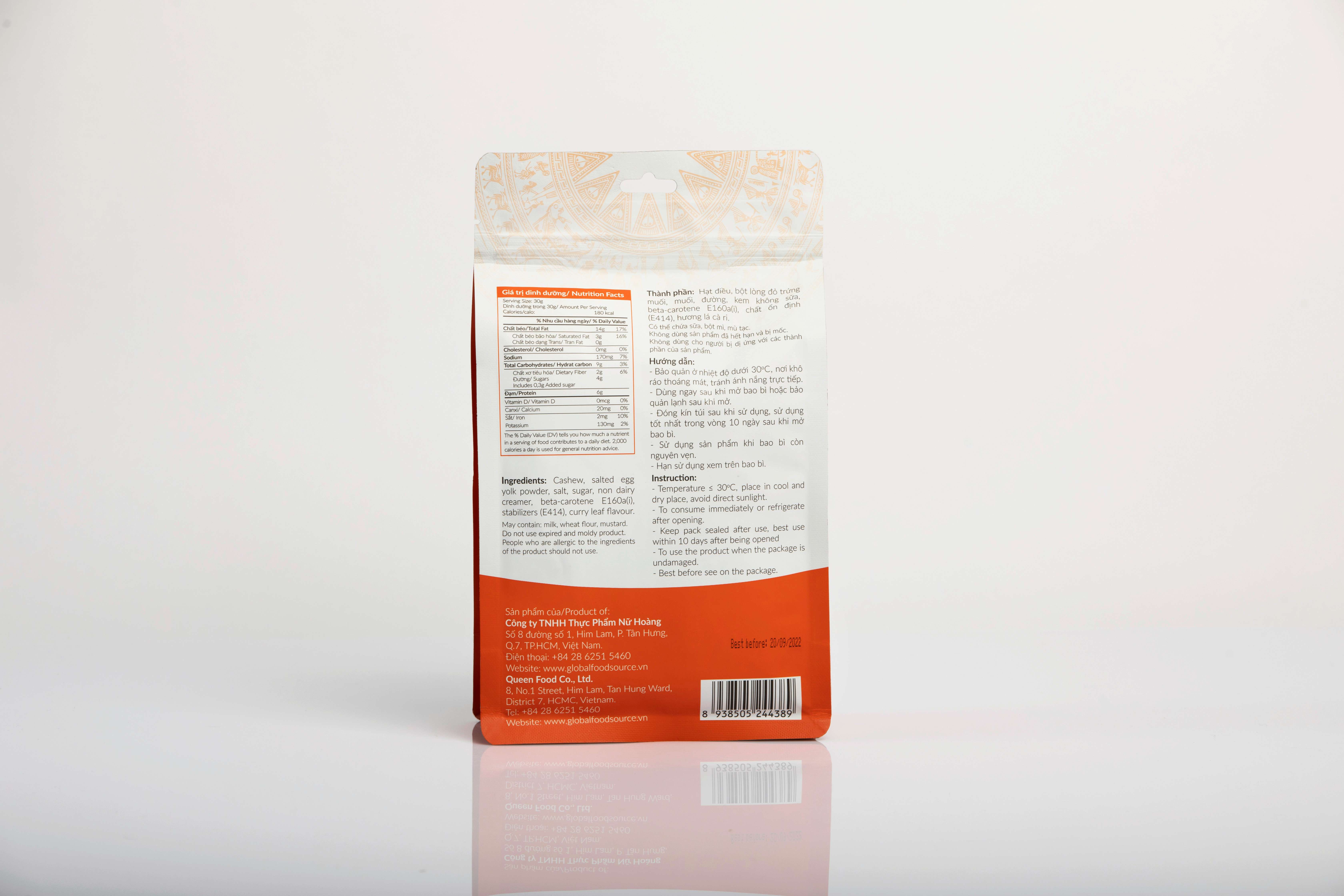 Trứng muối không chỉ là món ăn bổ dưỡng, thơm ngon mà người lớn và ngay cả trẻ nhỏ đều không thể cưỡng lại. Sản phẩm Hạt điều trứng muối có lớp vỏ bên ngoài mằn mặn, bùi bùi đặc trưng của trứng muối và kết hợp với hạt điều giòn rụm, béo và thơm. Sản phẩm được sản xuất trên quy trinh hiện đại, cam kết không sử dụng hóa chất và chất bảo quản. Sản phẩm được làm từ những hạt điều chọn lọc, to tròn, giòn béo với vị ngon tự nhiên chắc chắn sẽ là một sự lựa chọn tuyệt vời của bạn. Sản phẩm Hạt điều trứng muối dùng công nghệ rang sấy không chiên nên lưu giữ trọn nhất các chất bồi bổ có trong hạt điều như: vitamin, canxi, protein, magie… Kích cỡ hạt đều, hạt nguyên, chắc, có độ giòn cao, thơm béo.